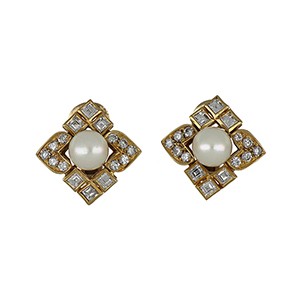 Orecchini in oro giallo di forma squadrata al centro una perla giapponese coltivata di 8 mm diamanti taglio carre' e brillante a contorno per ct. 1 80 ca.