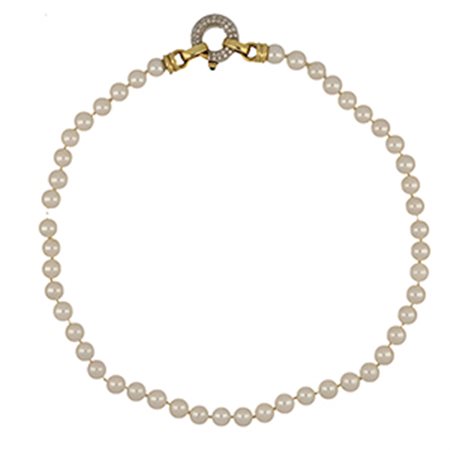Girocollo di perle giapponesi coltivate fermezza in oro giallo e bianco a foggia di grande moschettone rotondo interamente pavettata sui due lati con piccoli diamanti taglio brillante per ct. 1 10 ca.