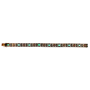 Bracciale in oro e argento piccoli rubini taglio rotondo intercalano pietre verdi opalescenti taglio cabochon ovali il tutto finemente inciso.