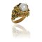 Anello in oro giallo con decorazione a foglie di vite in rilievo e perla centrale coltivata di 8 50 mm.