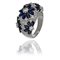 Anello in oro bianco a fascia bombata pavè di diamanti taglio brillante con decoro in zaffiri taglio navette a disegnare fiorellini in rilievo.