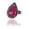Anello in oro bianco con grande rubino di forma a goccia taglio cabochon di stimati 8 00 ct. e piccoli diamanti neri di contorno per stimati 0 50 ct.