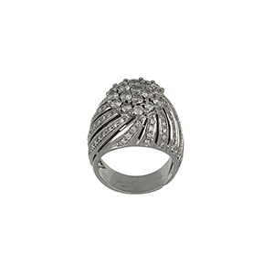 Anello in oro bianco a 'Turbante' la struttura a fascia è traforata e impreziosita da piccoli diamanti taglio brillante e un decoro nella sommita' con pavè di diamanti taglio brillante per ct. 1 00 ca.