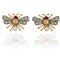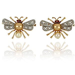 Coppia di spille in oro giallo e bianco piccole mosche con ali dispiegate due rubini come occhi e corpo impreziosito da perla e diamantini.