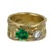 Anello in oro giallo con lavorazione a corteccia con incastonato un diamante di forma rotonda taglio a brillante di stimati 0 40 ct e uno smeraldo colombiano di forma a goccia di stimati 0 90 ct.