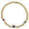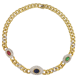Girocollo in oro giallo con maglia groumette alcune con piccoli diamanti taglio brillante al centro 3 ovali con smeraldo zaffiro e rubino taglio cabochon circondati da pavè di diamanti taglio brillante per complessivi ct. 4 50 ca.