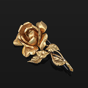 Spilla in oro giallo a forma di rosa il gambo lucido e i petali satin.