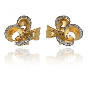 Orecchini in oro giallo e platino elegante manifattura a volute floreali con piccoli diamanti taglio 8/8 sulle creste.