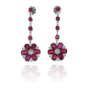Orecchini pendenti in oro bianco con rubini tondi e ovali di ottimo colore e trasparenza per totali stimati 6 20 ct e diamanti di forma rotonda taglio a brillante per stimati 1 60 ct.
