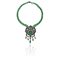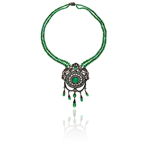 Collana in argento e oro giallo di manifattura orientale realizzata con smeraldi taglio cabochon e carrè nel medaglione centrale e diamanti taglio rosa il tutto sospeso da due fili di piccole boule anch'esse di smeraldi leggermente scalari.