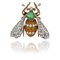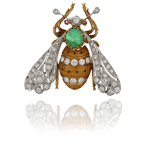 Spilla in oro giallo e bianco a forma di grande Ape smalti gialli a cloisonneau alternati a diamanti taglio brillante decorano il corpo insieme a uno smeraldo taglio cabochon e due piccoli rubini.