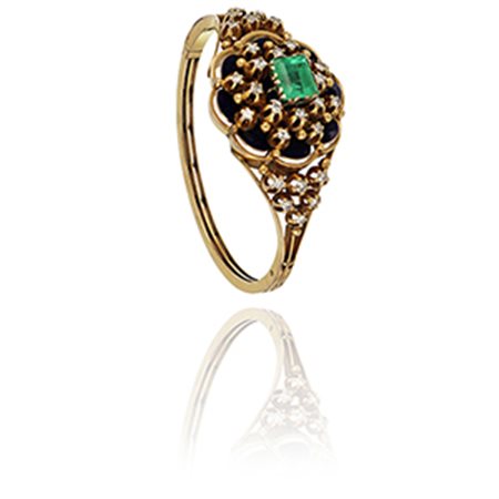 Bracciale rigido di antica lavorazione realizzato in oro giallo con al centro smeraldo colombiano taglio rettangolare di ct.3 00 ca. diamanti taglio 8/8 e smalti blu a completare il decoro.