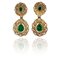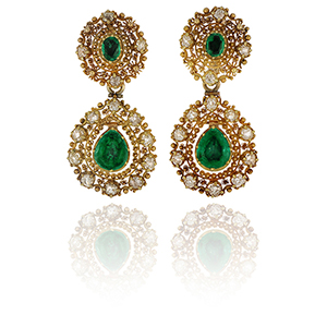 Orecchini d'epoca vittoriana in oro giallo di finissima lavorazione. a due corpi con smeraldi ovali e a goccia di origine colombiana diamanti old mine cut contornano il pendente.