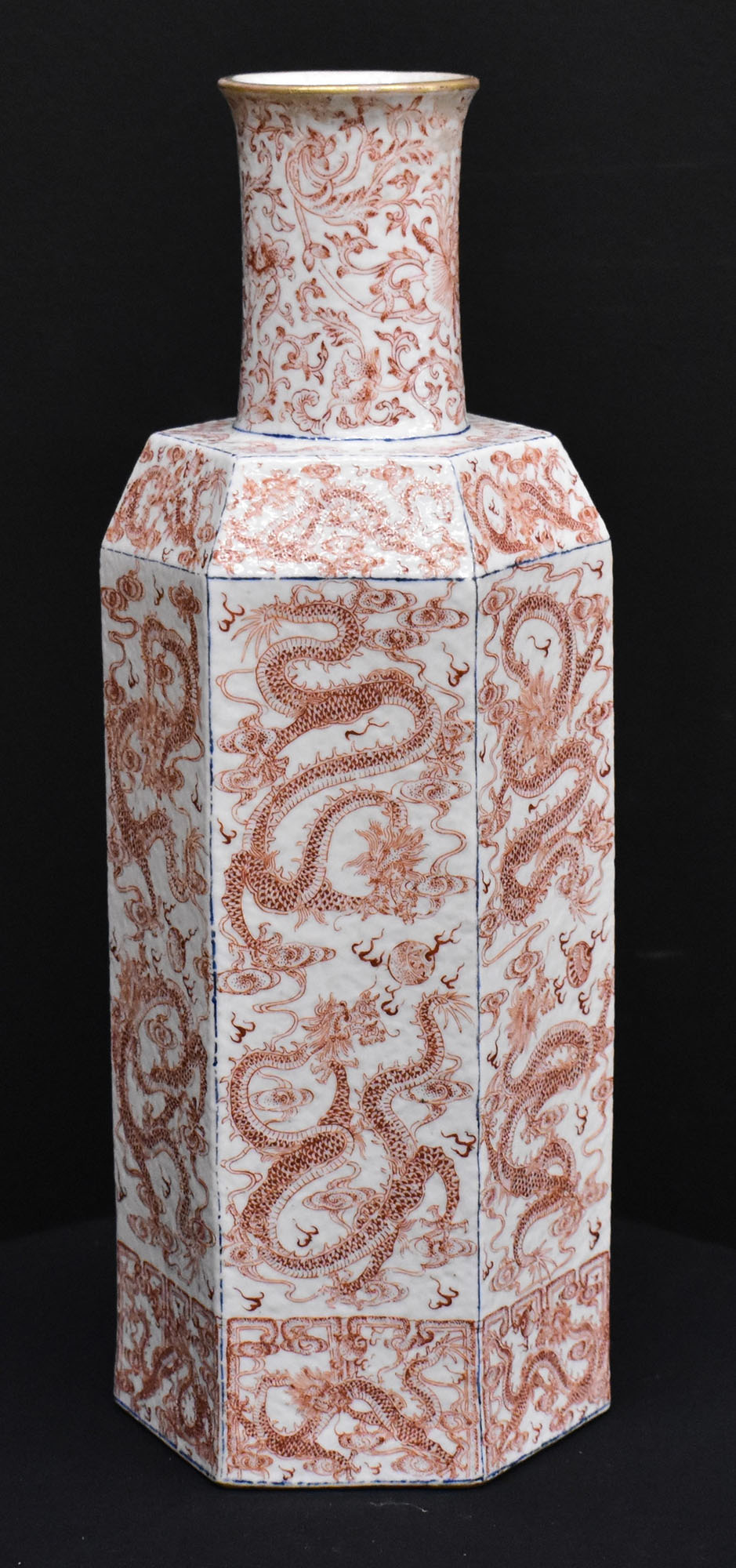 Precedente Lotto 0121 Successivo Casa d'Aste Martini - C.so Cavallotti 76, 18038 Sanremo ASTA NATALIZIA Sessione unica giovedì 12 dicembre 2024 ore 15:00 (UTC +01:00) CERAMICA Cina vaso esagonale in porcellana decoro rosso con dragonicm.x h. 35