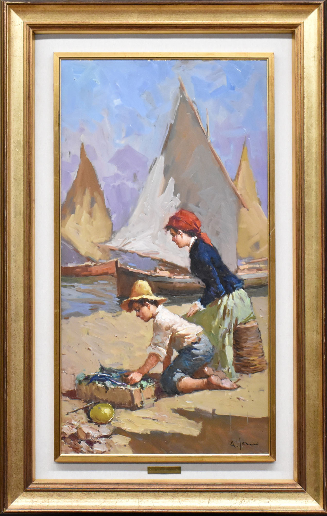 Alfonso Sarno 'Coppia di giovani sul molo' olio su tavoletta firmato in basso a destra