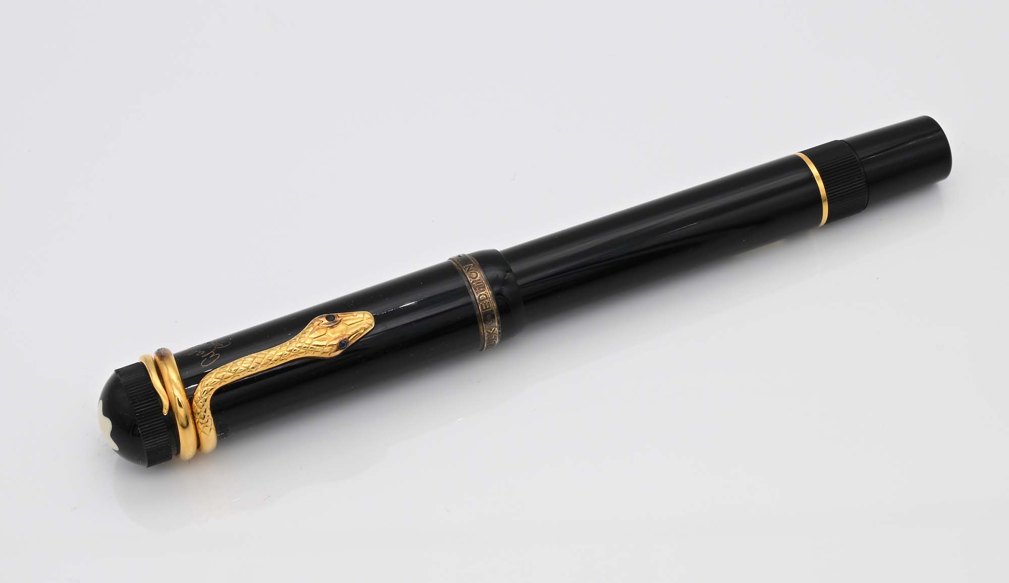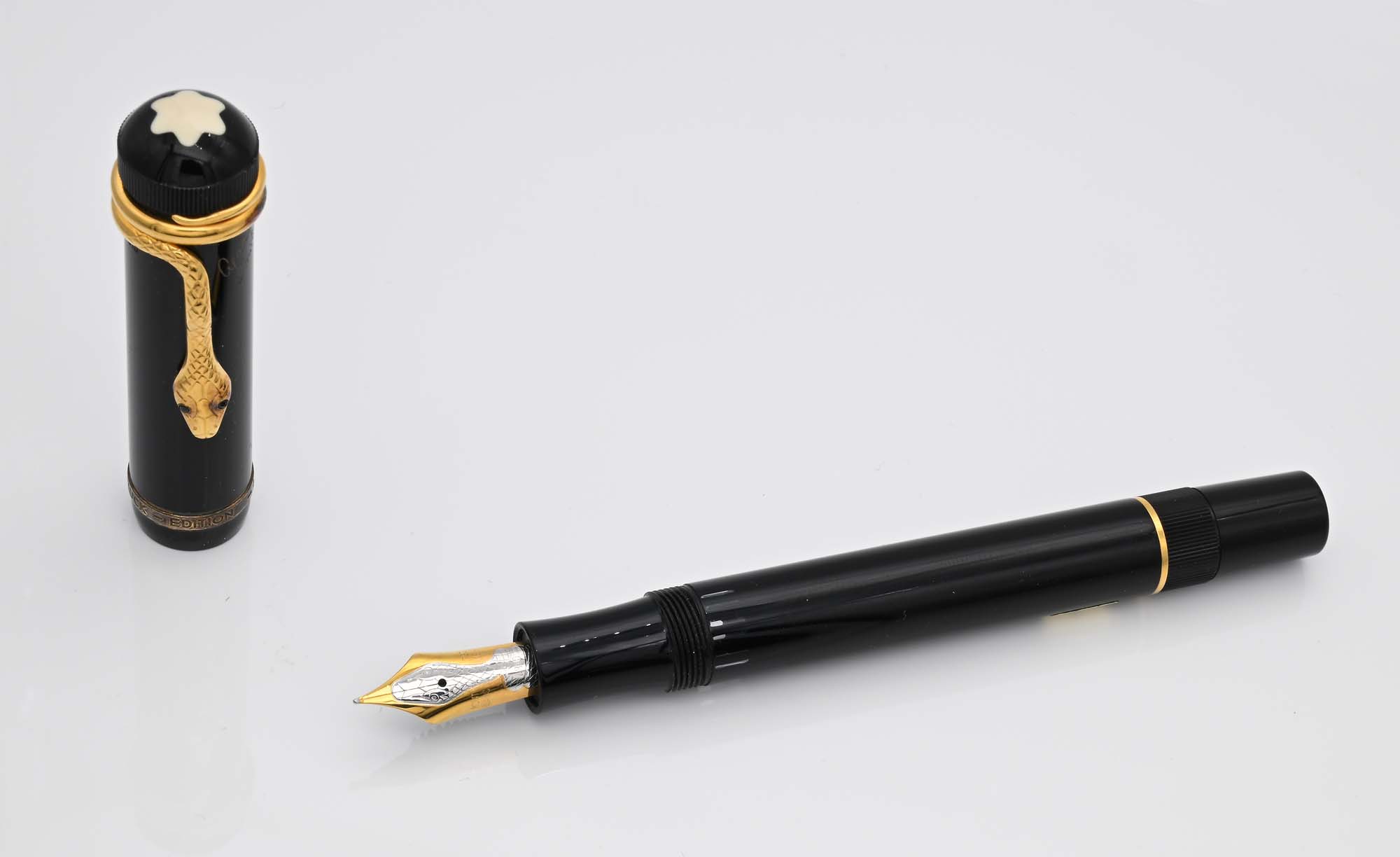 Montblanc Agatha Christie Limited Edition - Penna Stilografica in resina nera con clip a forma di serpente con due rubini incastonati e particolari in argento dorato 925/000 Come nuova. Mai usata. Esemplare da esposizione in negozio. Tiratura limitata in 4810 esemplari, Ns. n. 2605. Pennino F in oro bicolore 18 Kt