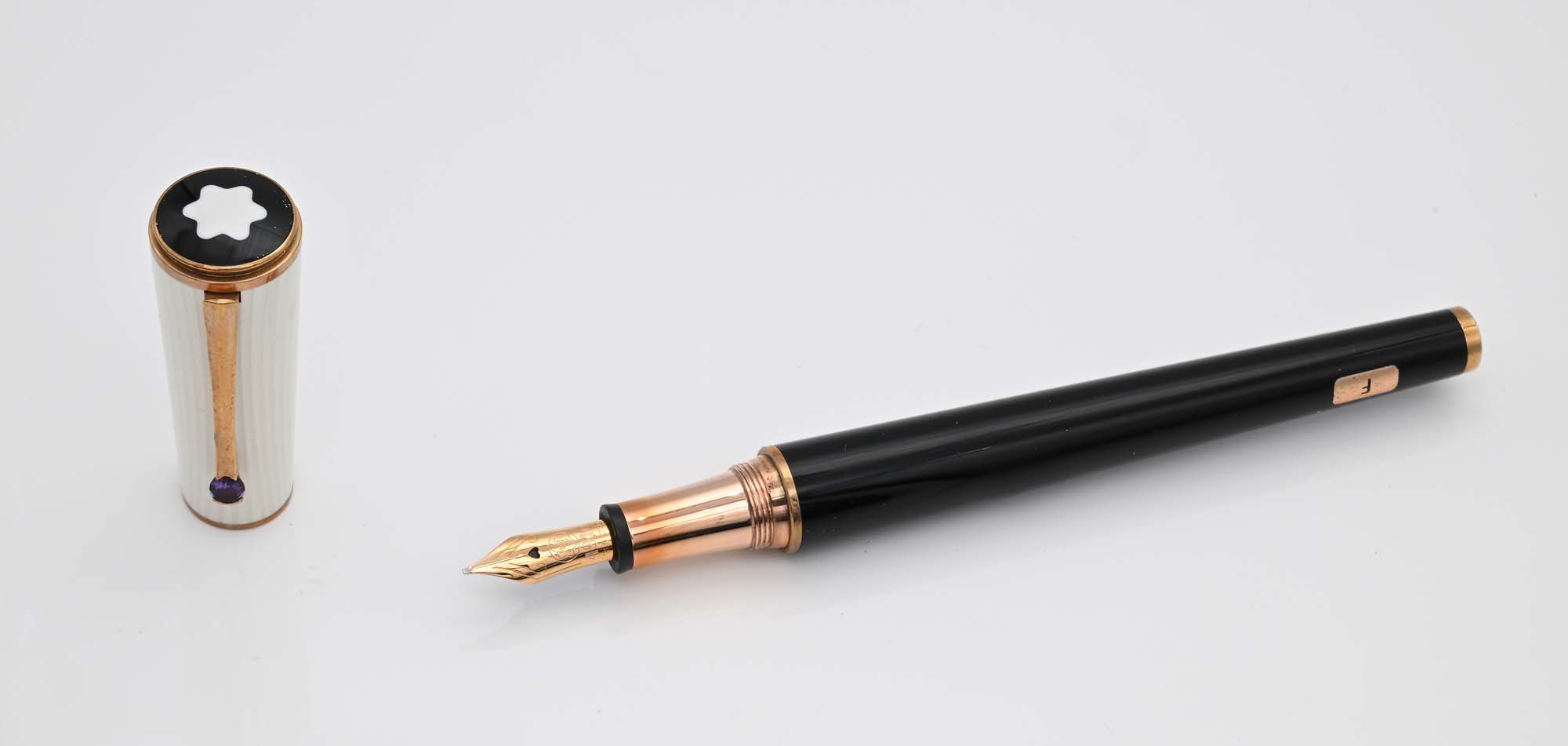 Montblanc Ingrid Bergman La Donna Special Edition 104904 - Penna Stilografica in resina nera e metallo con lacca bianca ed inserti placcati in oro rosso con ametista sulla clip (Mod. 28907) Come nuova. Mai usata. Fondo di negozio con cartellino. Nr. CU1871324 Pennino M (sostituito) in oro giallo 18 Kt. Entro astuccio di velluto con scatola di cartone, istruzioni e garanzia originali. Con controscatola di cartone originale