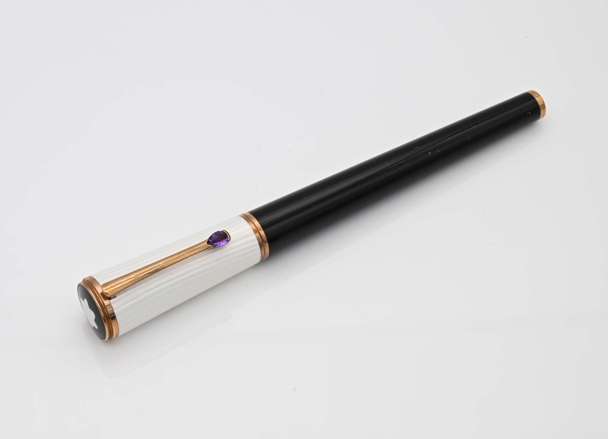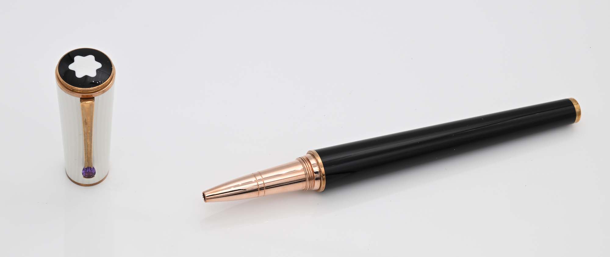 Montblanc Ingrid Bergman La Donna Special Edition 104906 - Roller in resina nera e metallo con lacca bianca ed inserti placcati in oro rosso con ametista sulla clip (Mod 28909) Come nuova. Mai usata. Fondo di negozio. Nr. PT2245193 Entro astuccio di velluto con scatola di cartone, istruzioni e garanzia originali. Con contro scatola di cartone originale. Esemplare mancante di refill