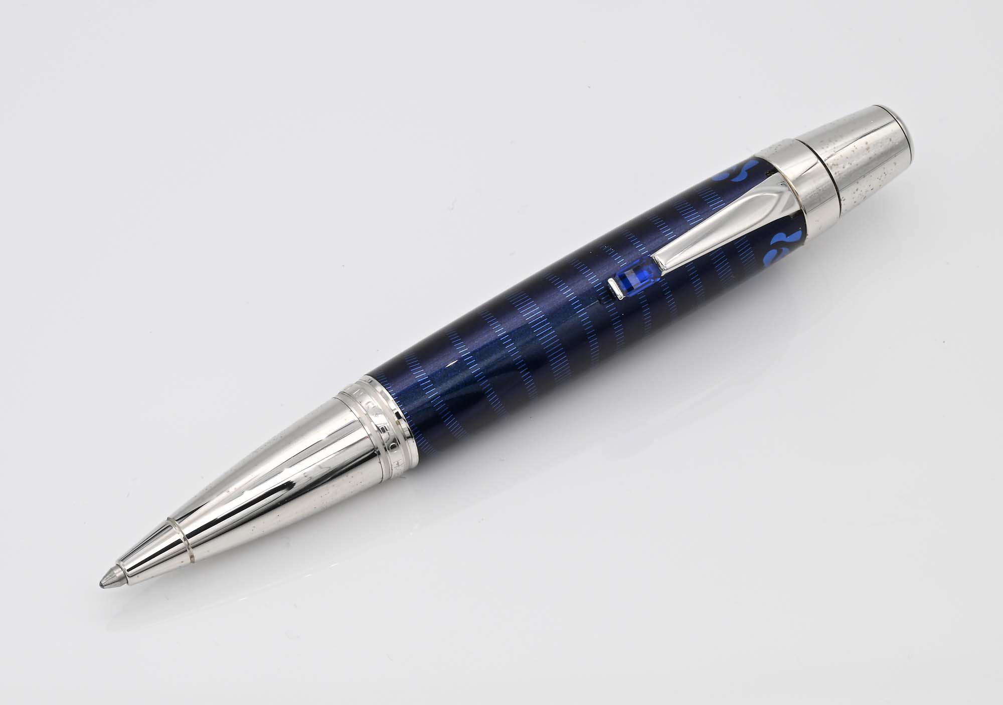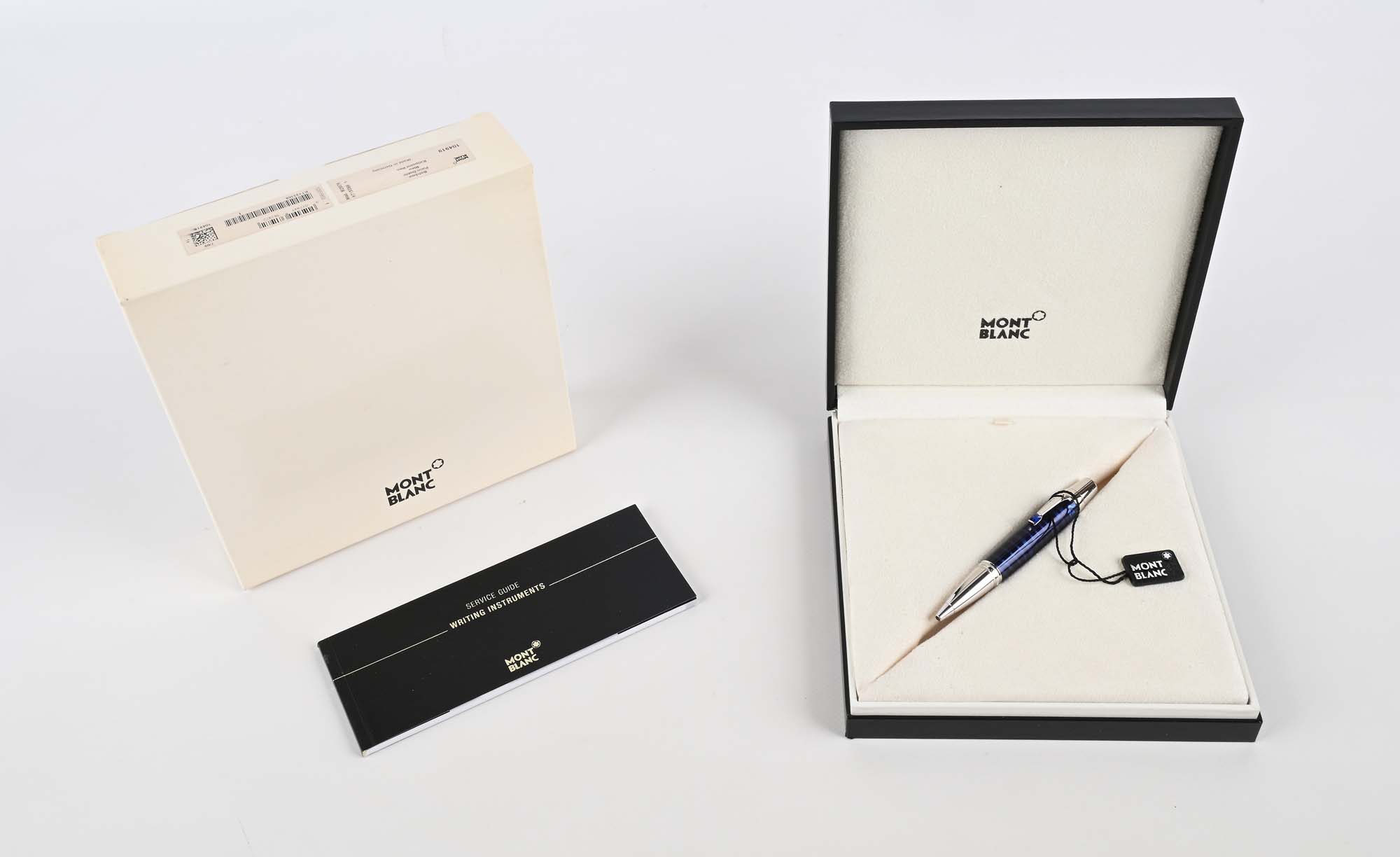 Montblanc Bohème Paso Doble Bleu 104919 - Penna a sfera in metallo con finiture platino e pietra color zaffiro, con lacca bleu incisa con motivo ispirato alla danza del Paso Doble Mod 25579 Come nuova. Mai usata. Fondo di negozio con cartellino. Nr. KT1333681 Entro astuccio con scatola di cartone, istruzioni e garanzia originali. Con controscatola di cartone originale