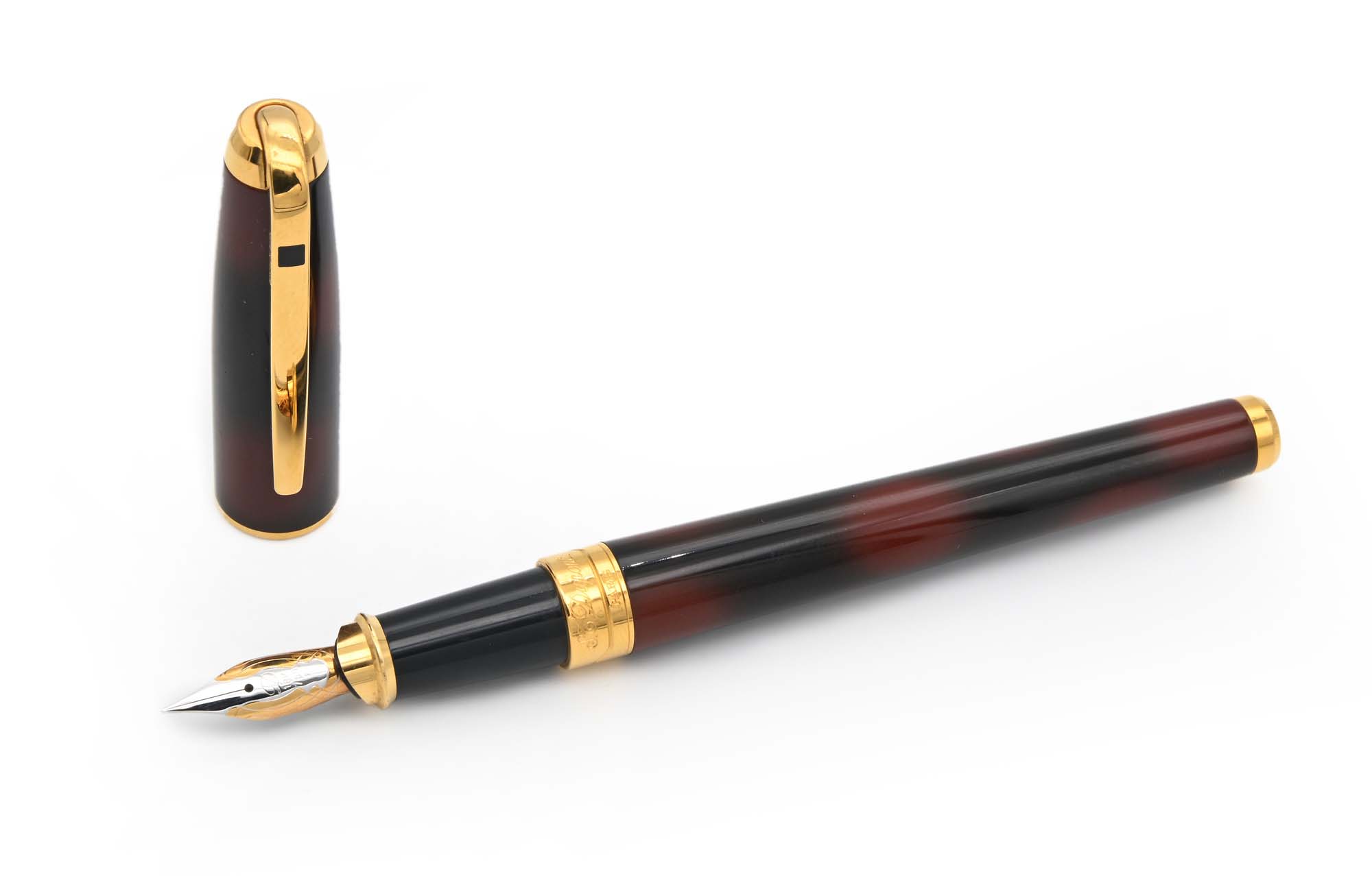 Dupont Olympio Lacca di China Tartar - Penna stilografica in lacca di China con particolari dorati (480536M) Nr 5A2KN46. Pennino F in oro bicolore 18 Kt. Entro astuccio con controscatola di cartone, garanzie, istruzioni e refills originali