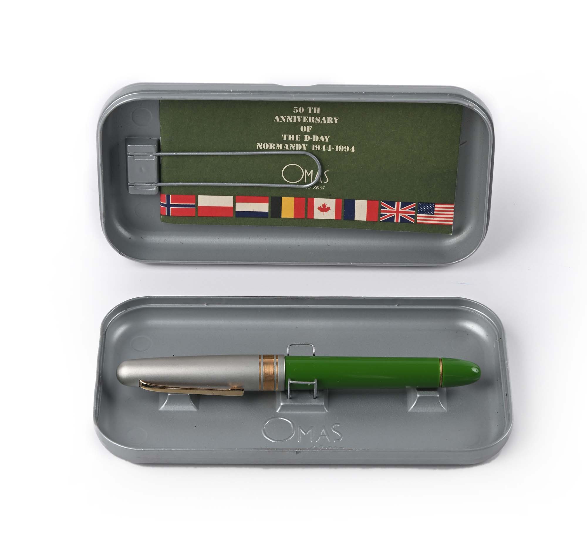 Omas Extra 50th Anniversary of the D-Day 1944-1994 - Penna stilografica in vernice con finitura in metallo e particolari dorati 1994 Mai usata. Nr 1481. Pennino M in oro giallo 18 Kt. Tiratura limitata a 5.300 esemplari per commemorare il cinquantenario dello sbarco alleato in Normandia. Entro astuccio originale di metallo con istruzioni e garanzia