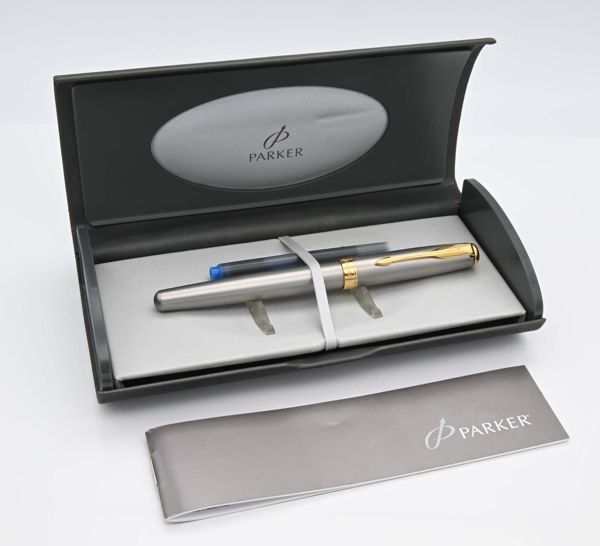 Parker Sonnet T.II - Penna stilografica in metallo satinato con particolari dorati Mai usata. Entro astuccio di pelle con controscatola di cartone, istruzioni e garanzia originali.