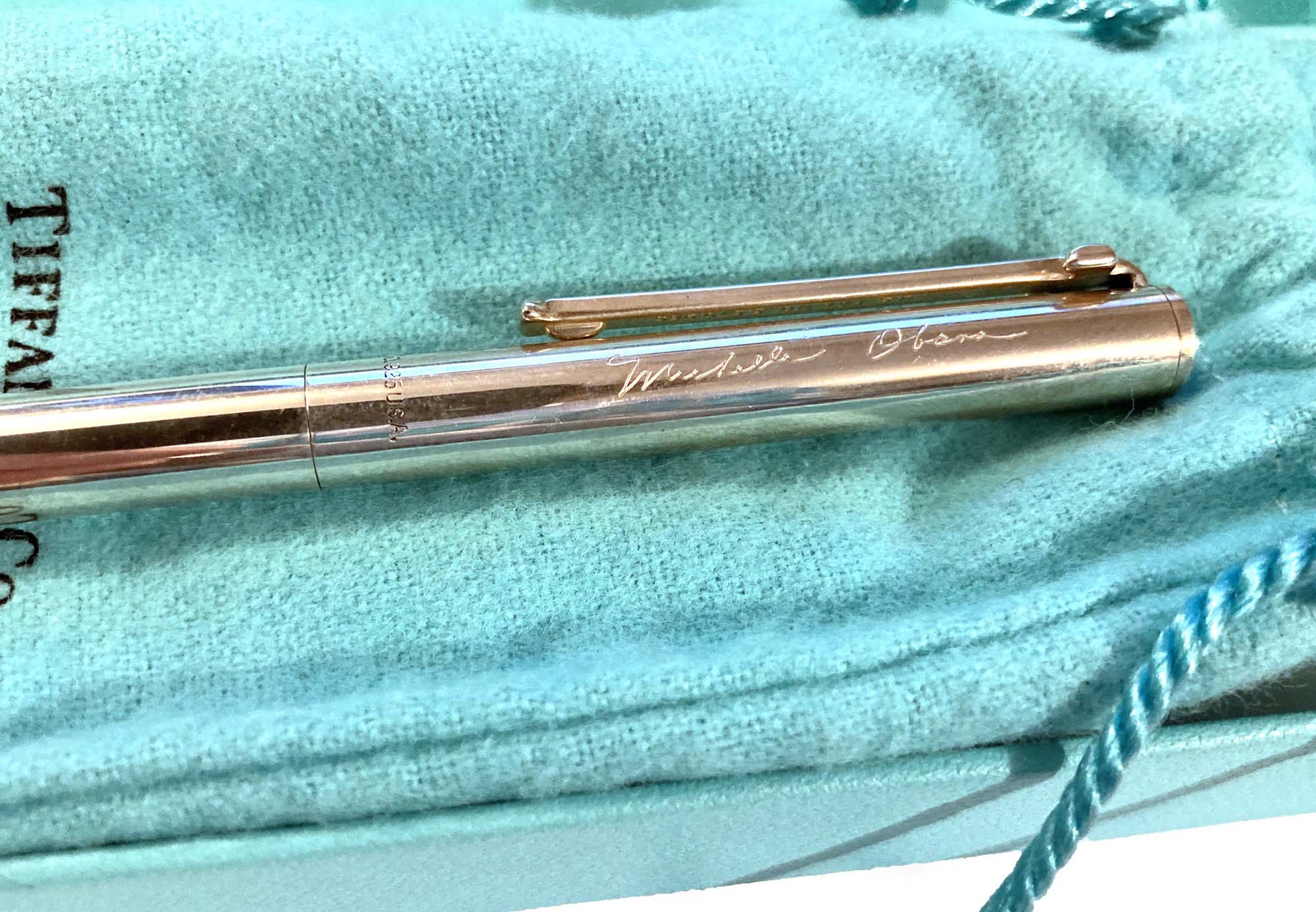 Tiffany & Co. Executive - Penna a sfera in argento sterling 925/000 Pat. 5.570.965. Dono di Michelle Obama all'attuale proprietà. Reca incisa sul fusto la firma di "Michelle Obama". Entro astuccio di tessuto con scatola originali con stemma in oro applicato della Casa Bianca. Certificato di garanzia Tiffany.
