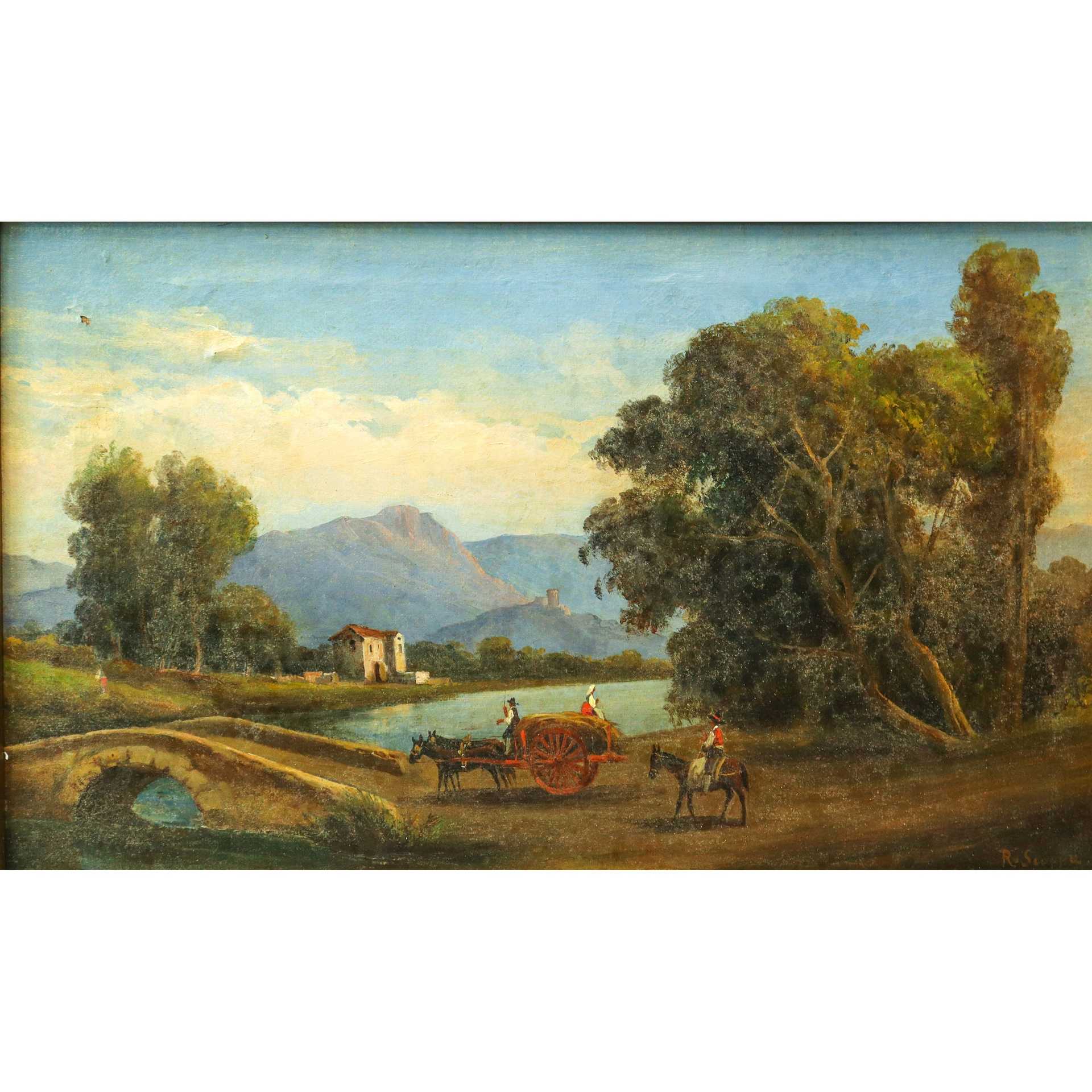 Raimondo Scoppa (Napoli 1820-Napoli 1890) - Paesaggio fluviale con ponte h cm 46X70 in cornice 60X84 Firmato in basso a destra. Lieve caduta di colore in alto a destra Firmato in basso a destra. Lieve caduta di colore in alto a destra