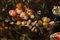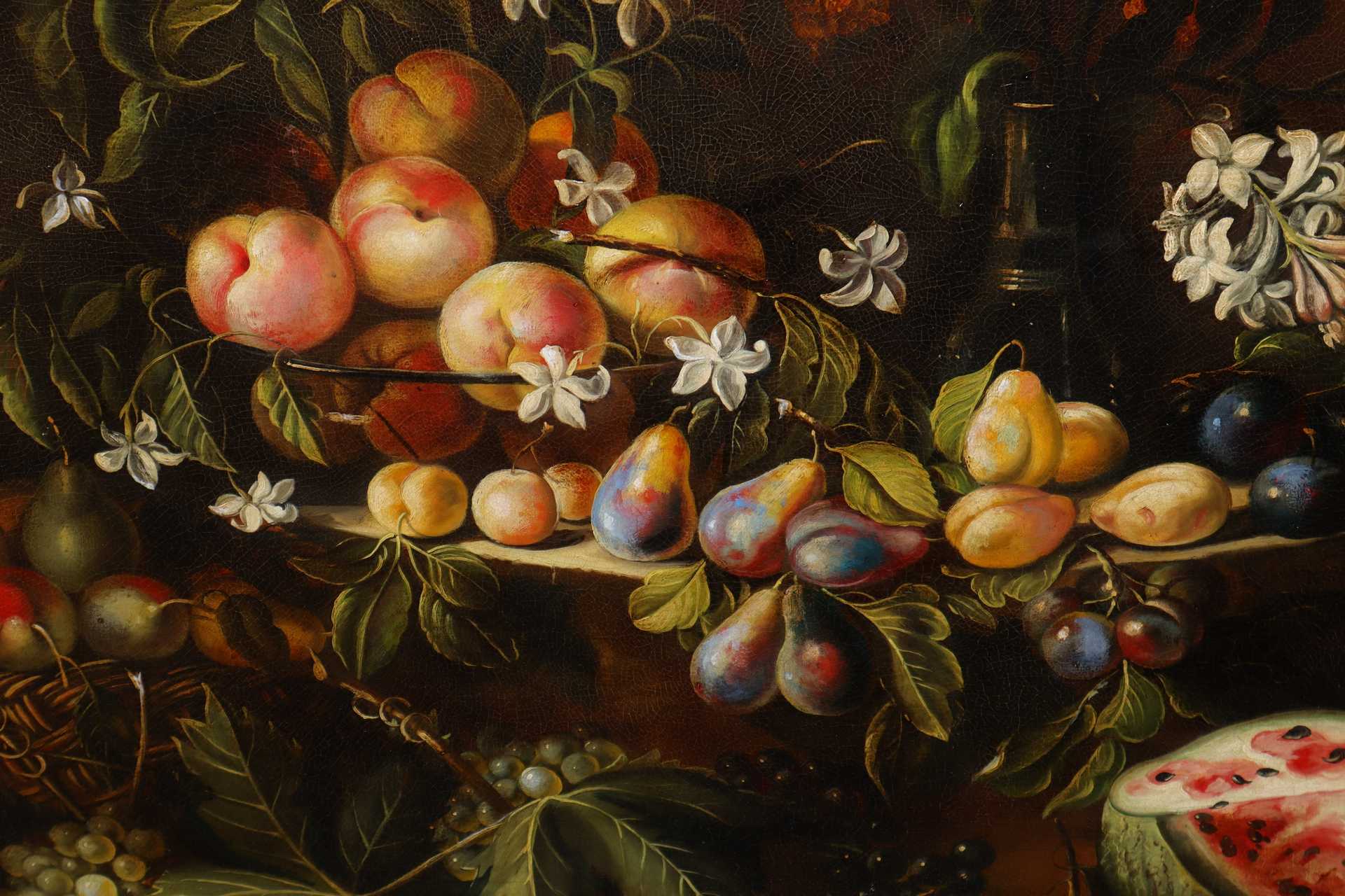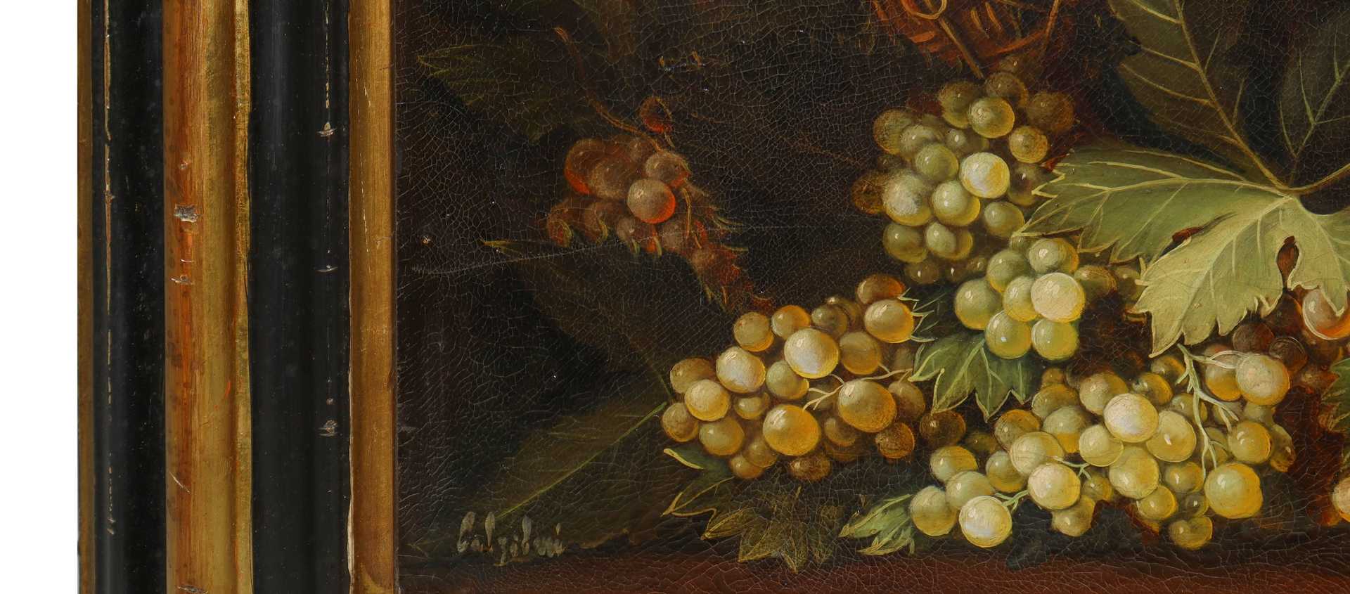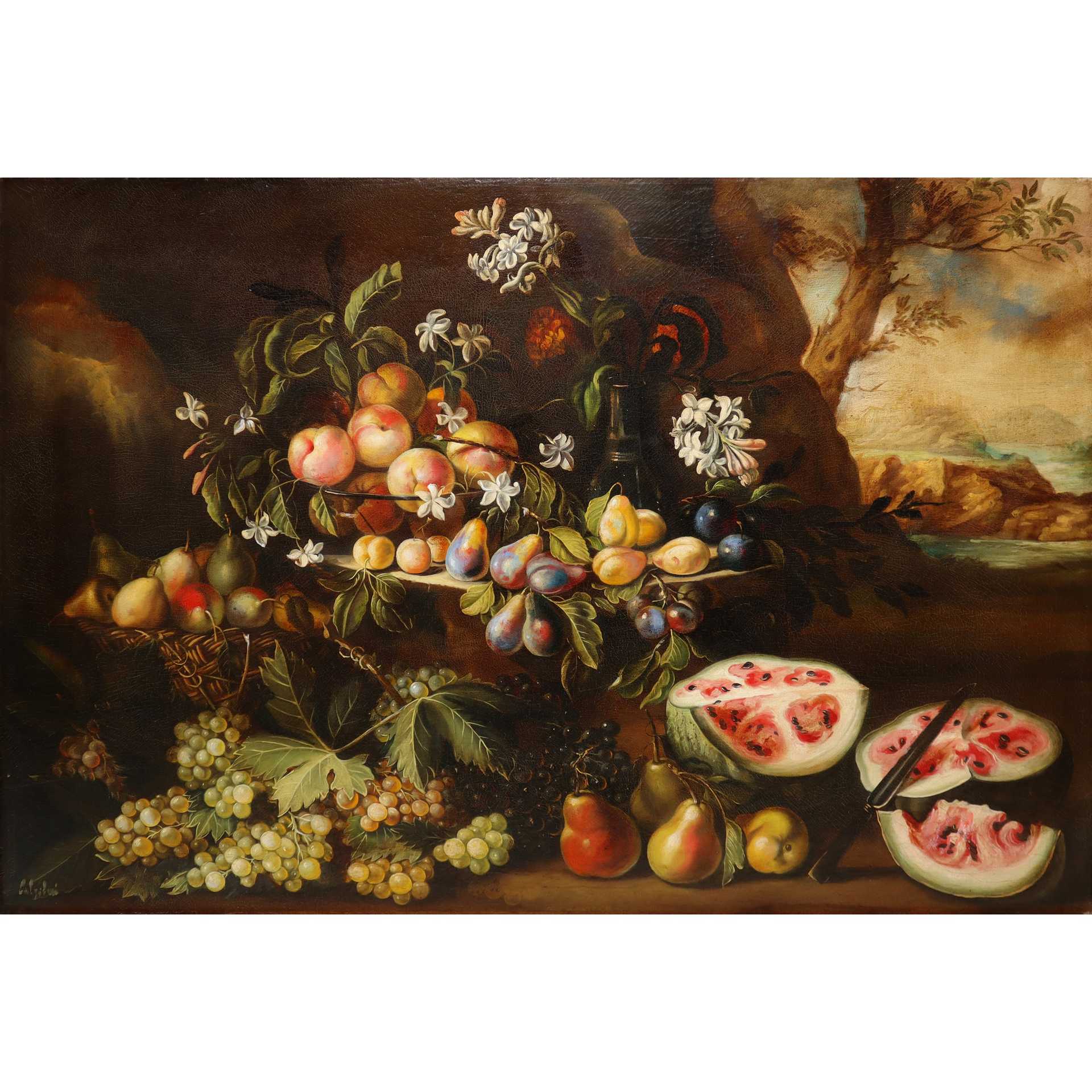Ida Calzolari (1936) - Natura morta con pesche, anguria, pere, uva, gelsumino e paesaggio sullo sfondo