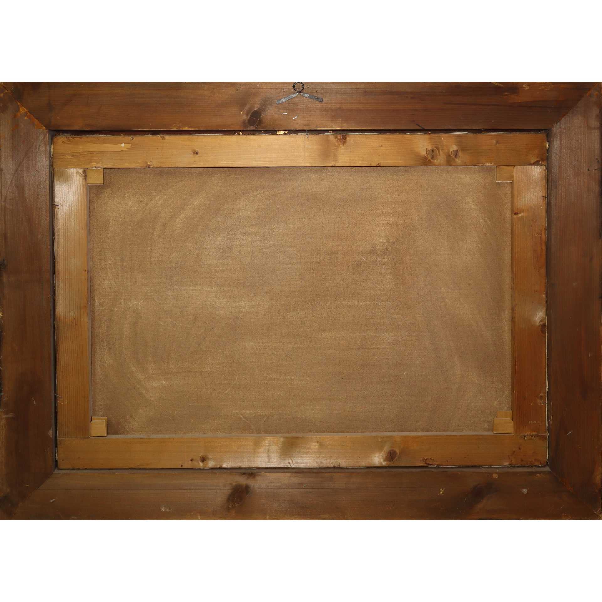 Ida Calzolari (1936) - Natura morta con pesche, anguria, pere, uva, gelsumino e paesaggio sullo sfondo H cm 70x99, in cornice cm 92x121 olio su tela