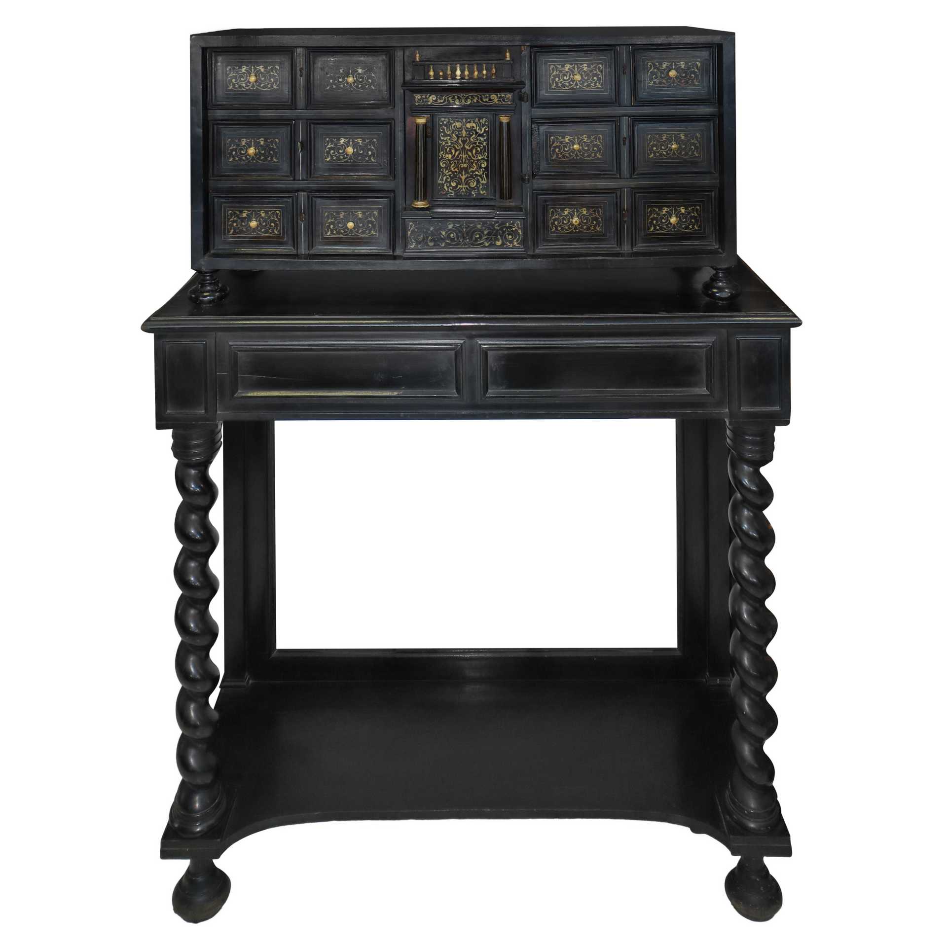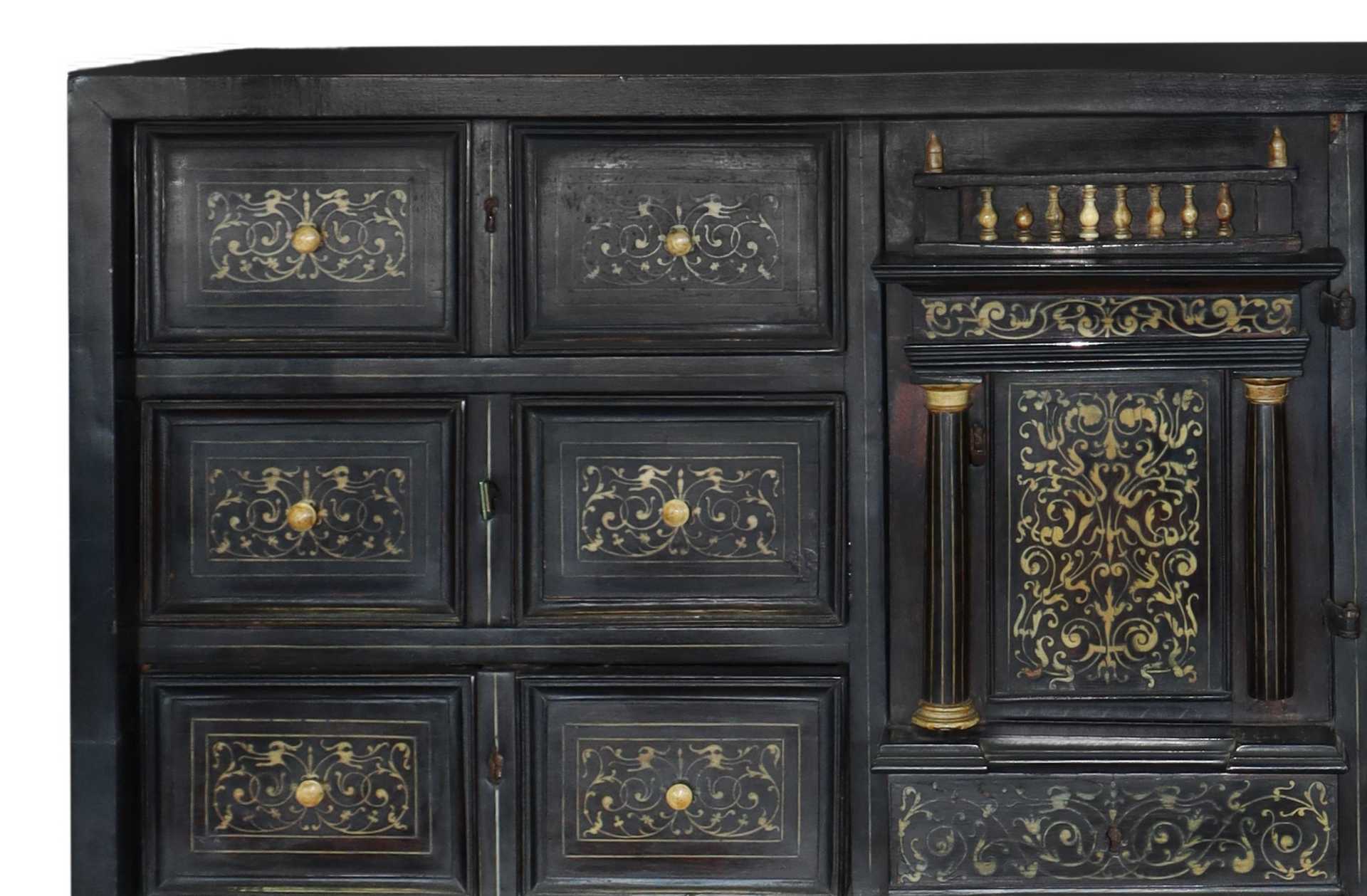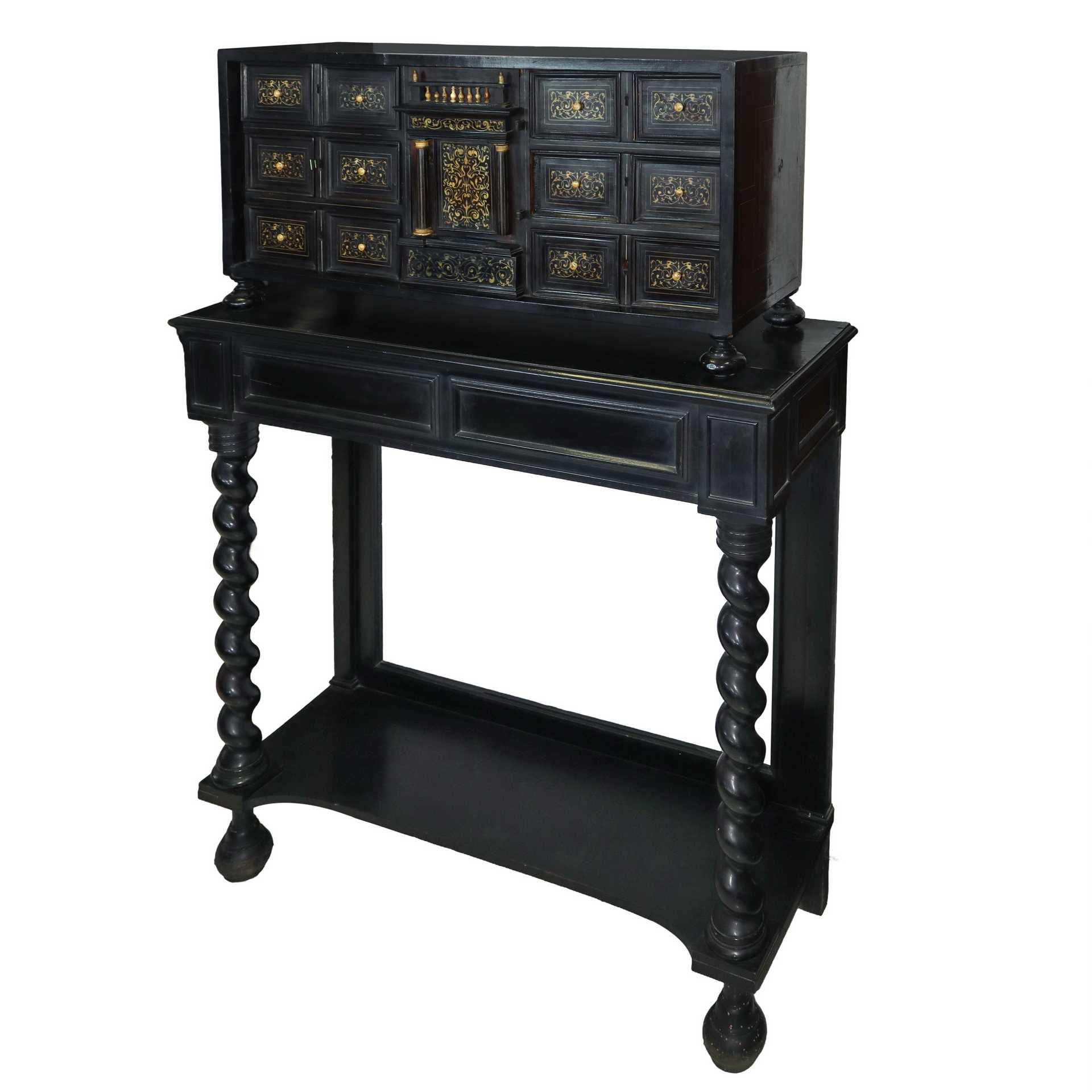 Monetiere in legno ebanizzato, 6 cassette per lato. , 18° secolo base cm 100X105x37 monetiere cm 44X90X38 Porticina centrale con colonne nere e capitelli dorati. Sormontato da balaustre, intarsi nello stile neorinascimentale. Base a motivi floreali in legno nero ebanizzato con colonne a torchion. Minime mancanze.Porticina centrale con colonne nere e capitelli dorati. Sormontato da balaustre, intarsi nello stile neorinascimentale. Base a motivi floreali in legno nero ebanizzato con colonne a torchion. Minime mancanze.