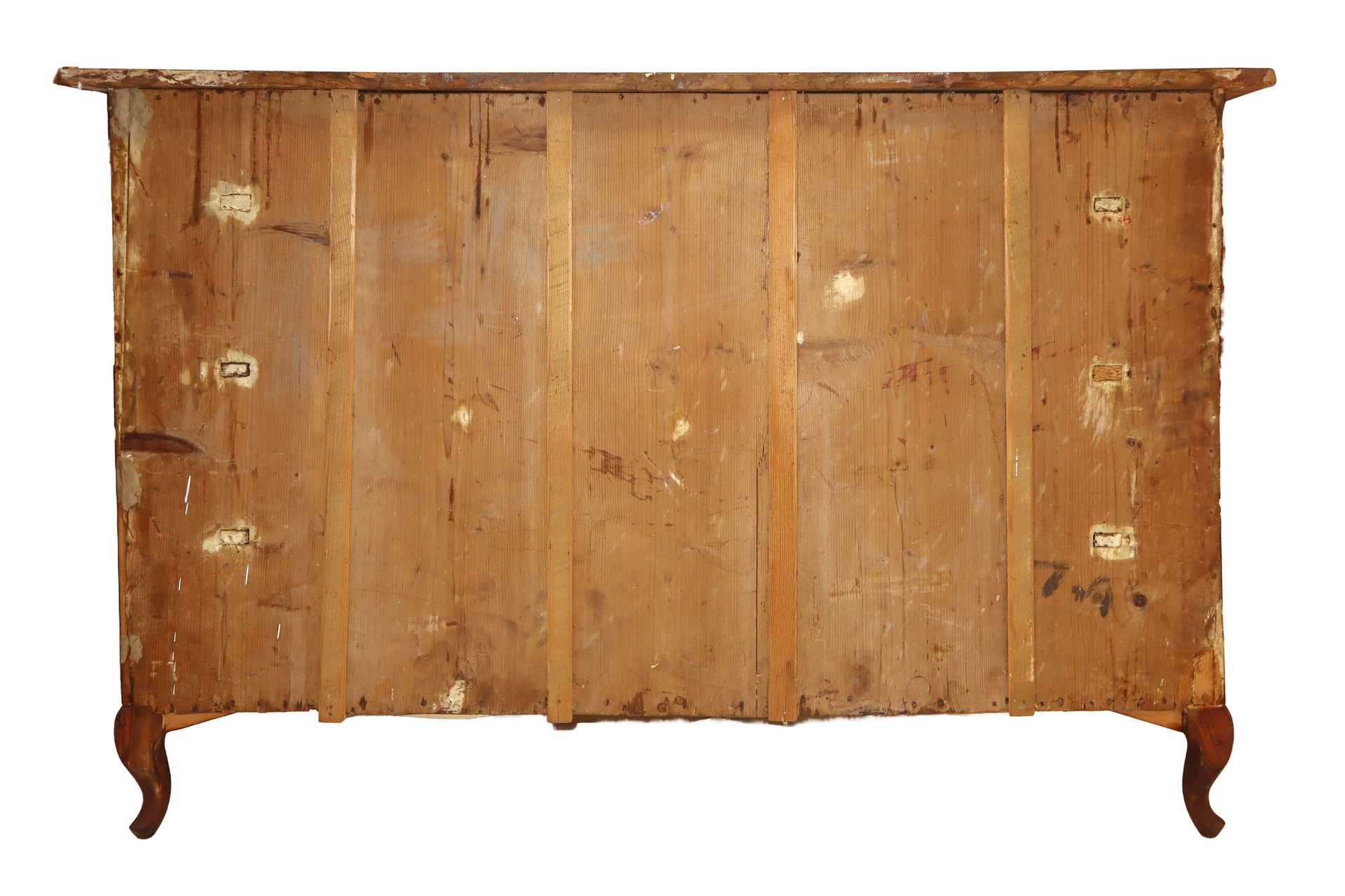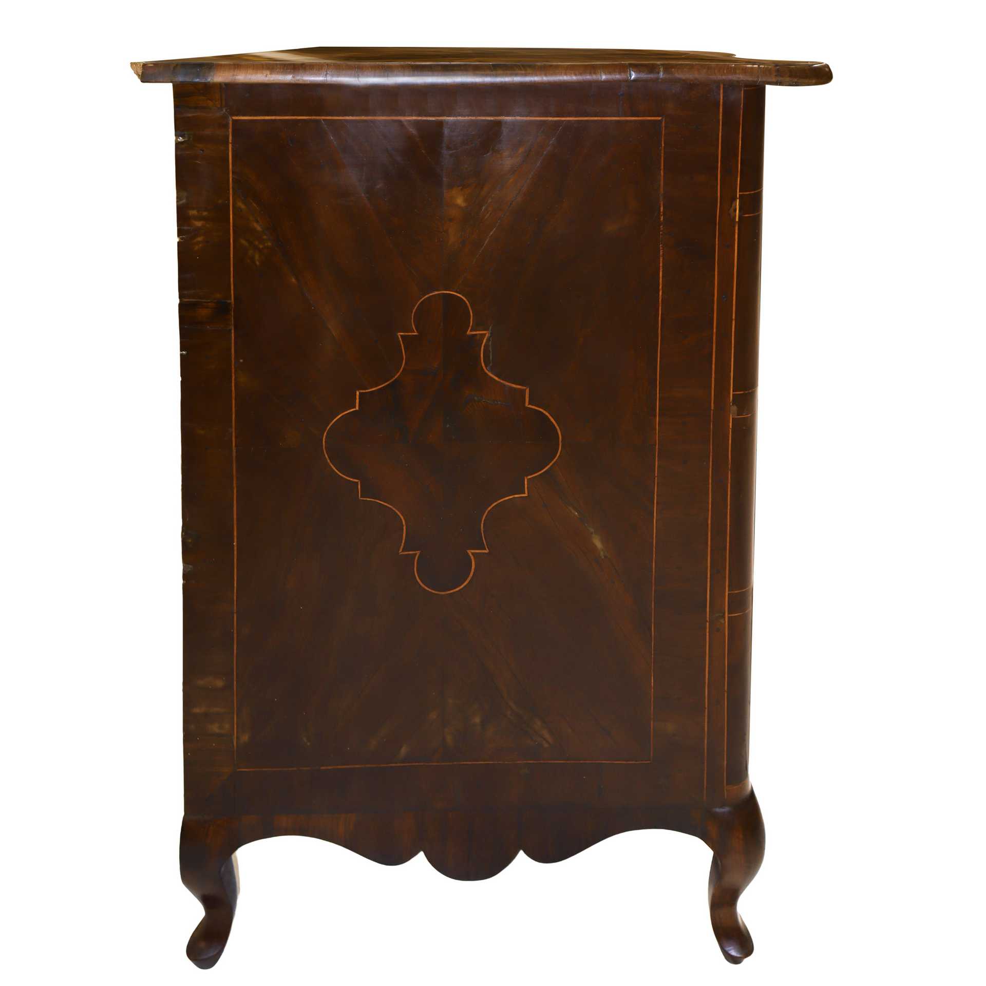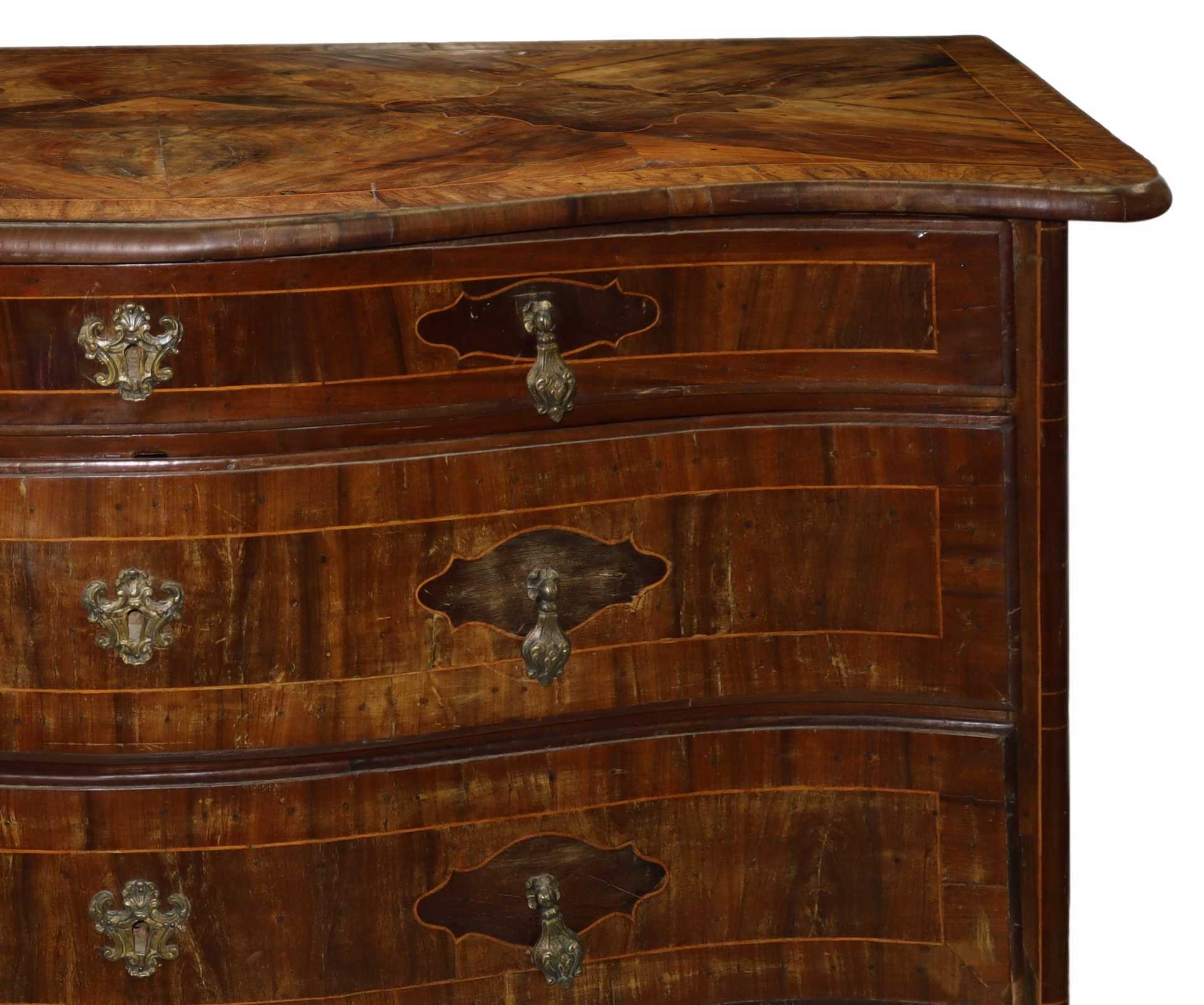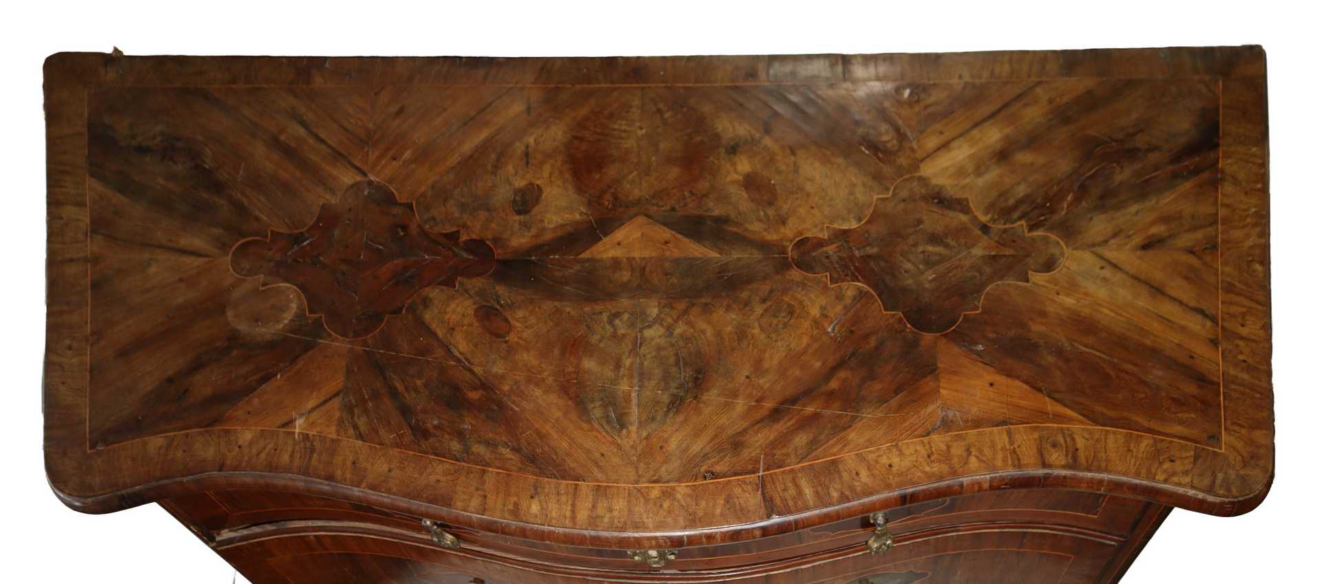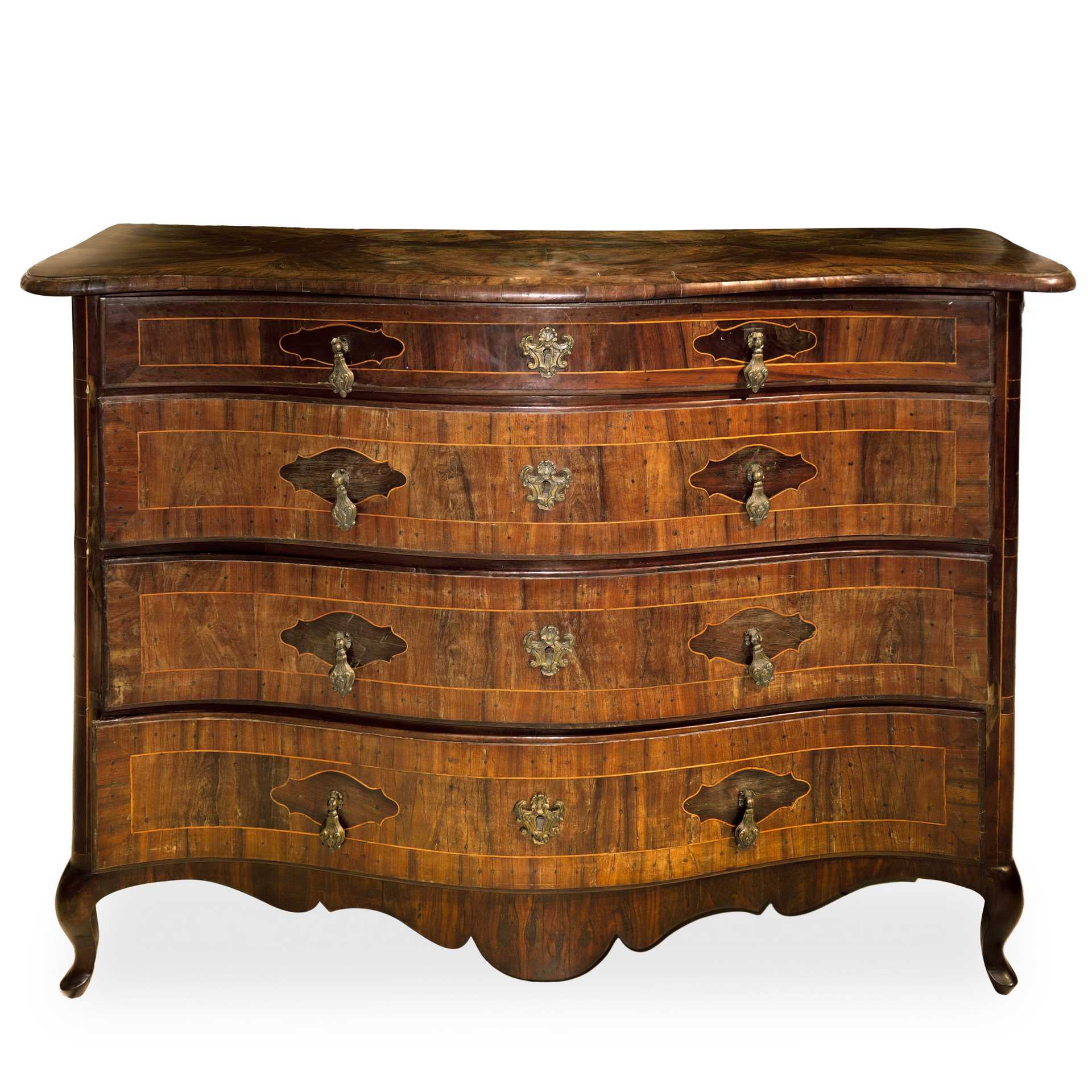 Cassettone maltese Luigi XV, fronte bombato , 4 cassetti filettati, lastronati in legno in radica di noce e ulivo, metà 18° secolo