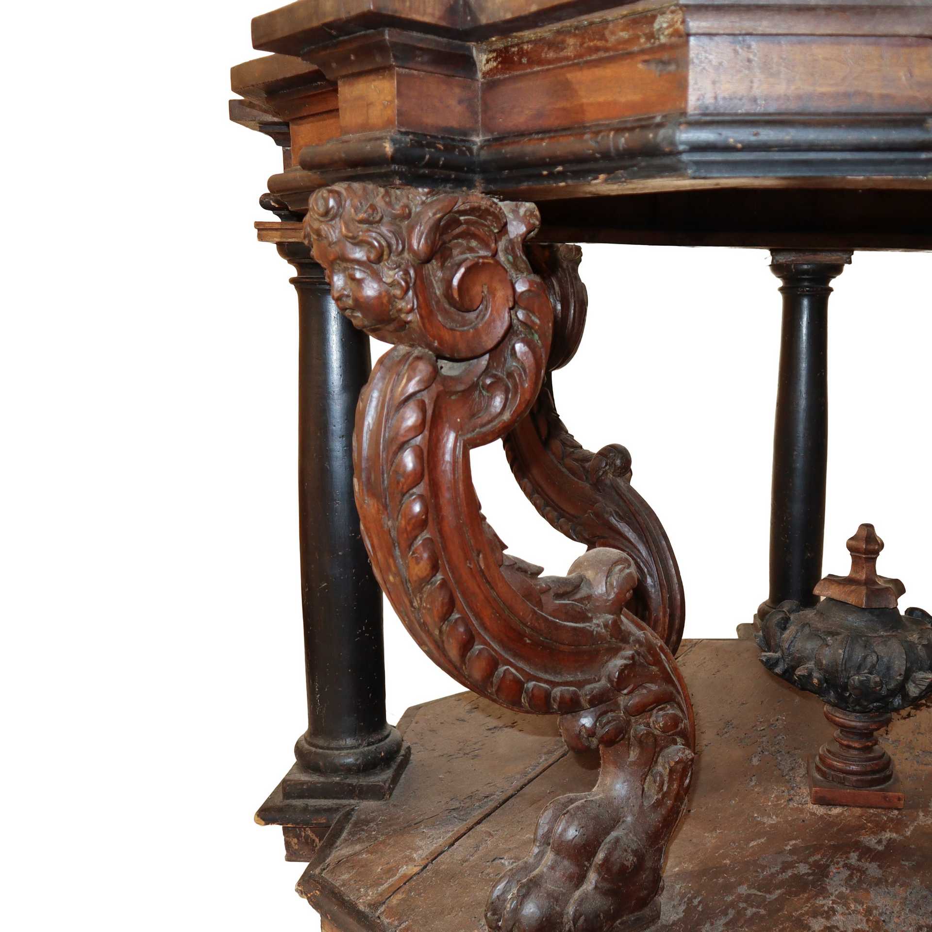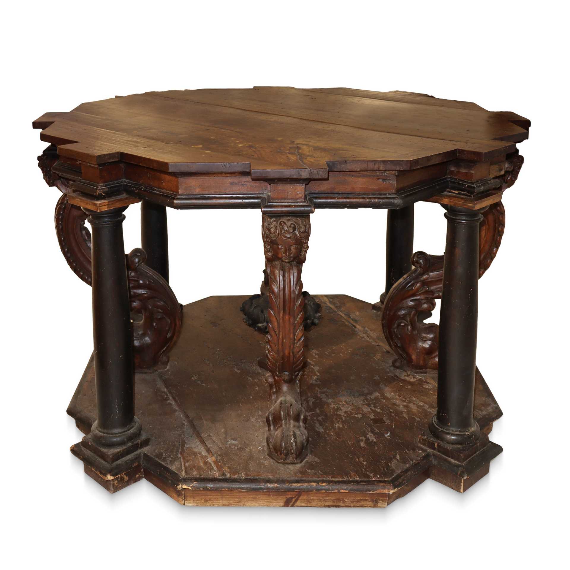 Tavolo in noce massello con piano frastagliato, base ottagonale, gambe intagliate e scolpite, piede leonino, 19° secolo