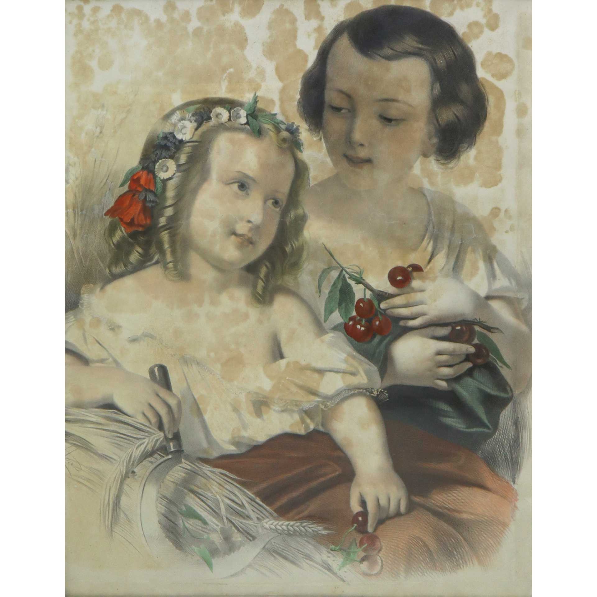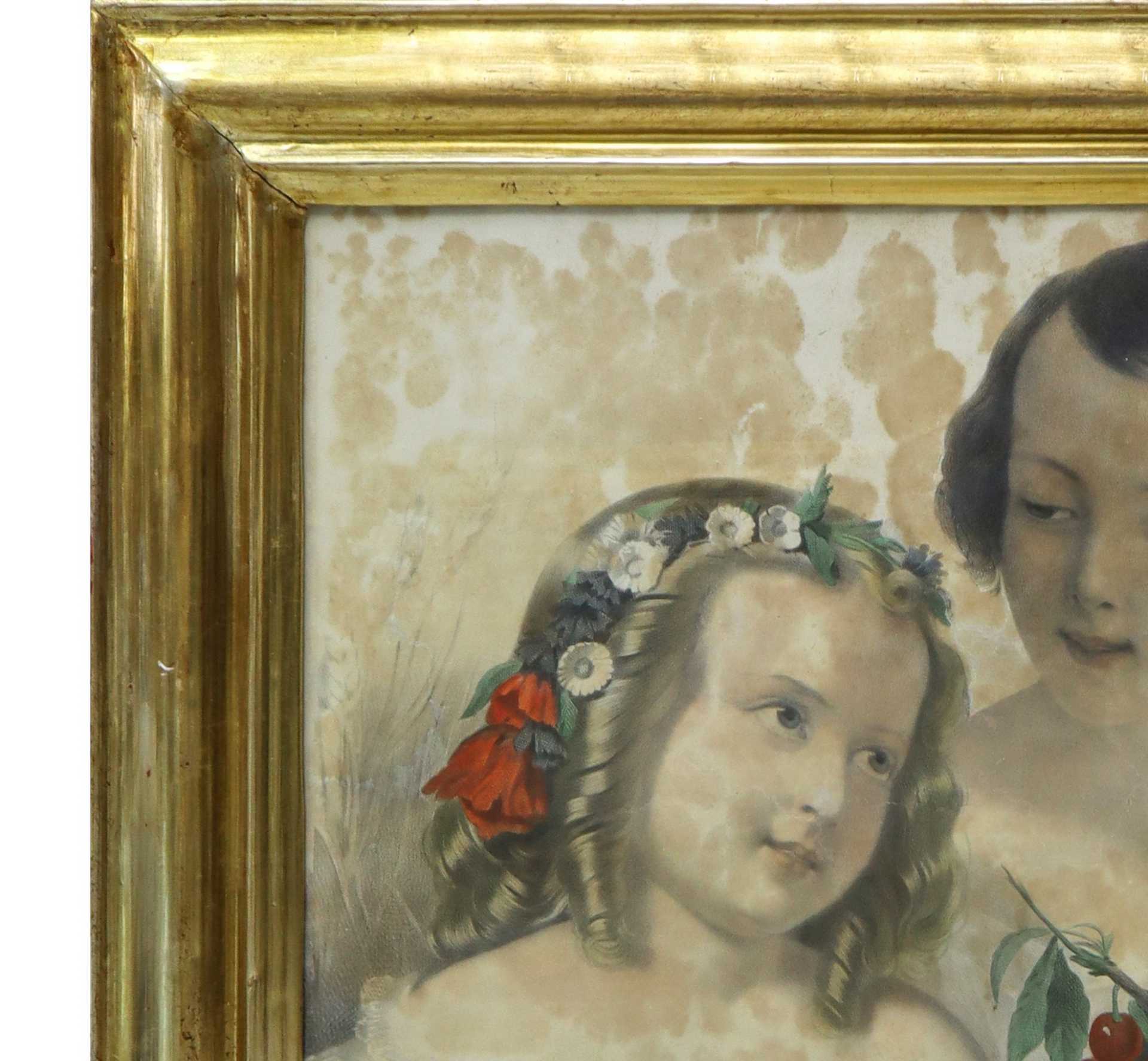 Cornice dorata con litografia le due sorelle, 19° secolo