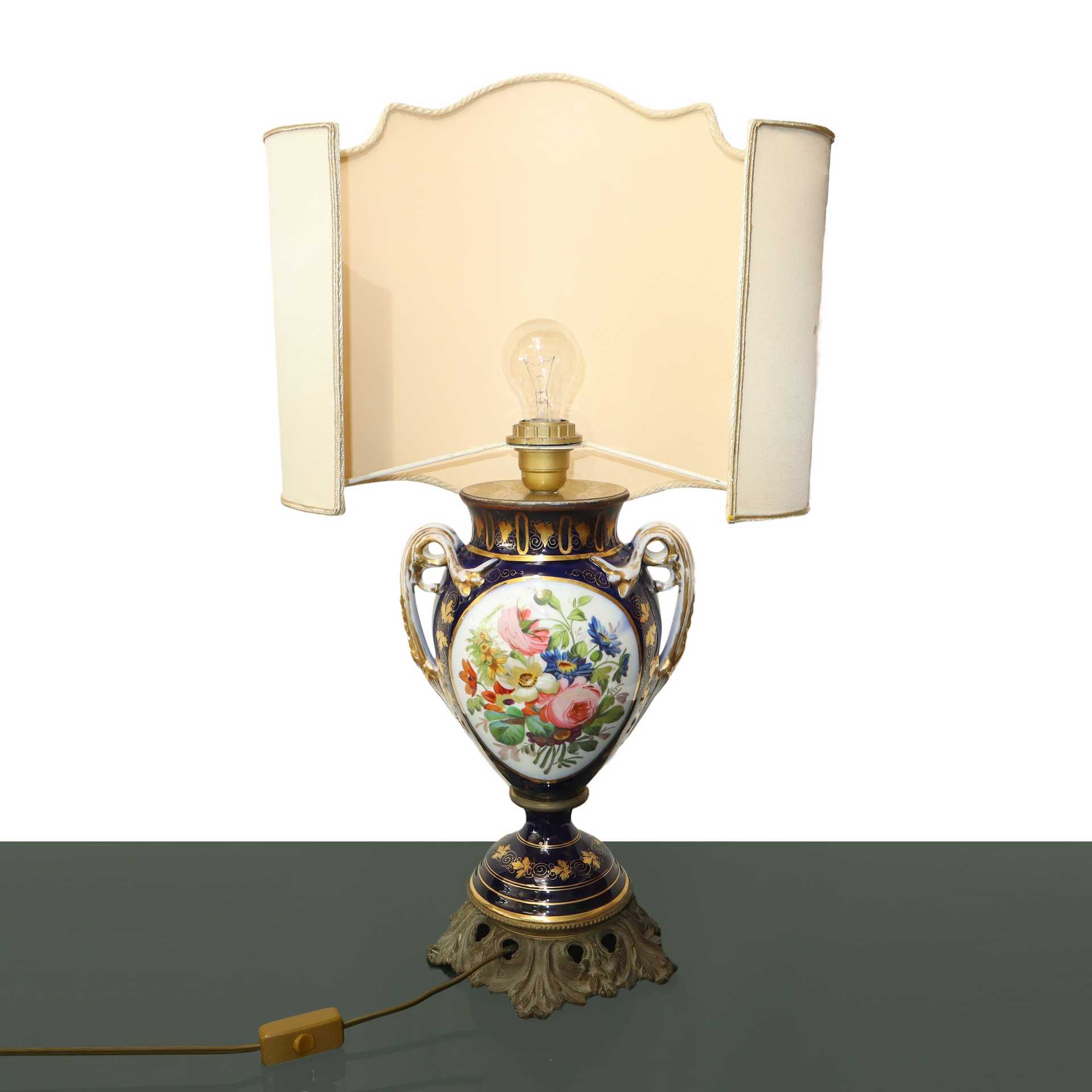 Coppia di lumi con vasi in porcellana dipinti con scene di genere e motivi floreali in porcellana blu stile Sevres, France 19° secolo
