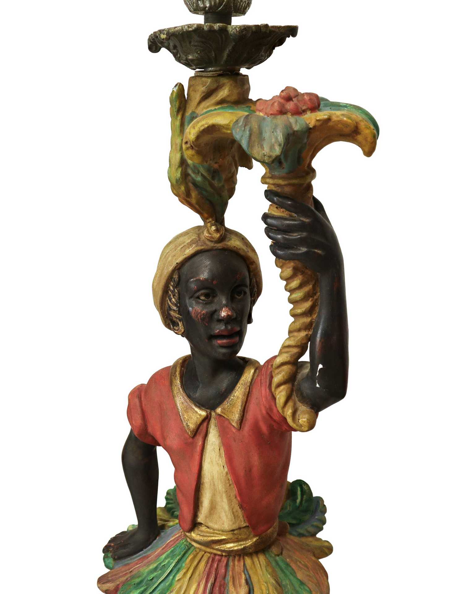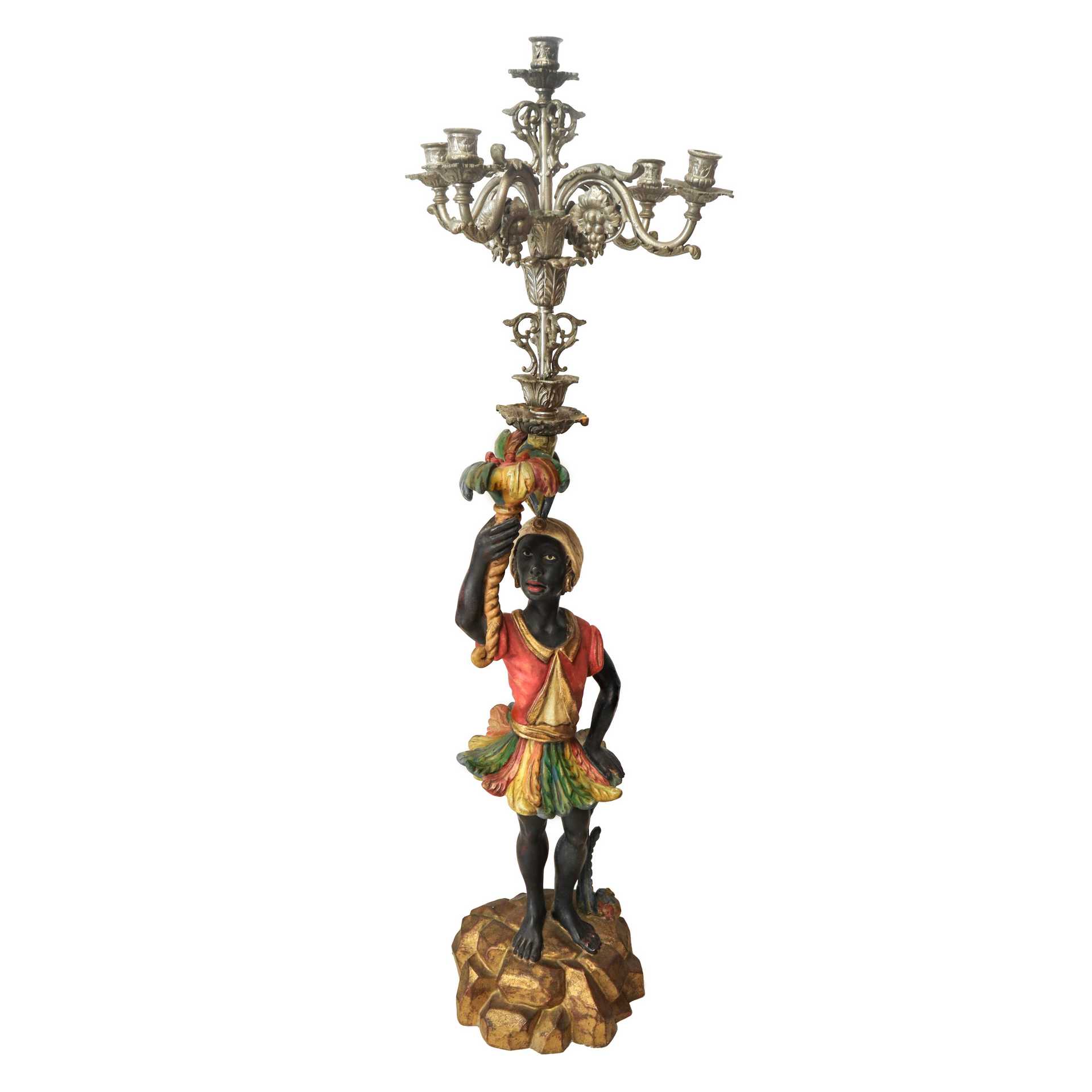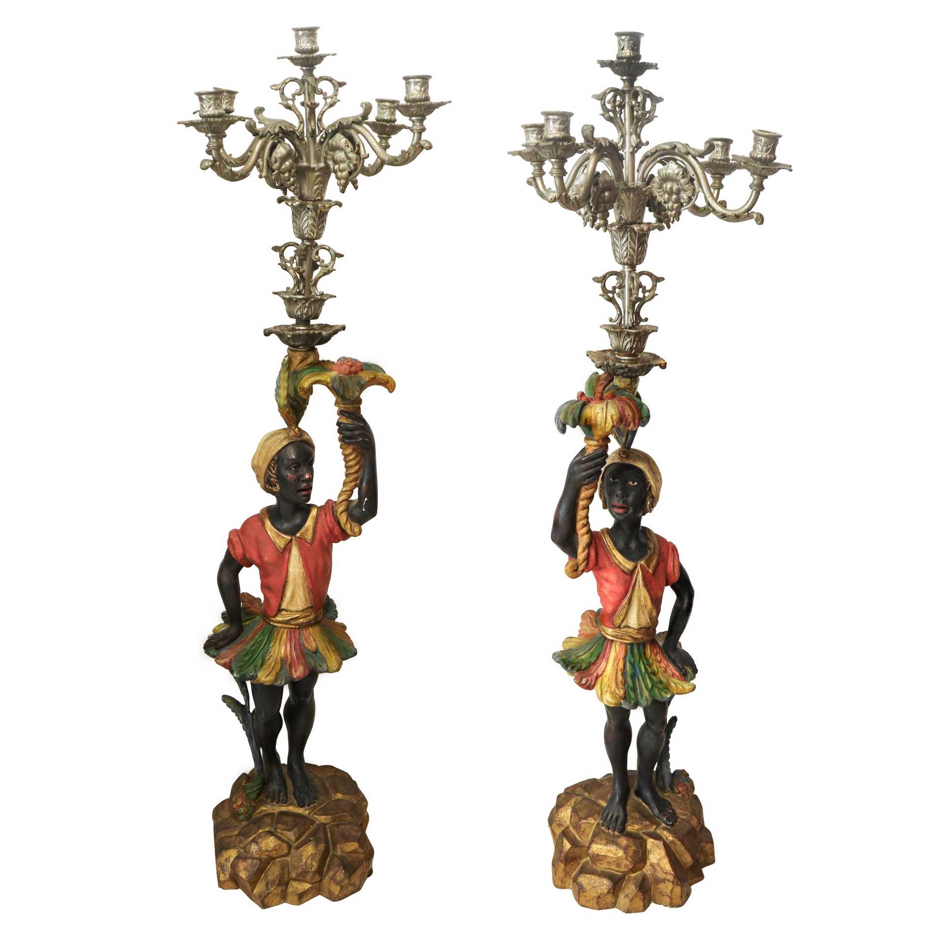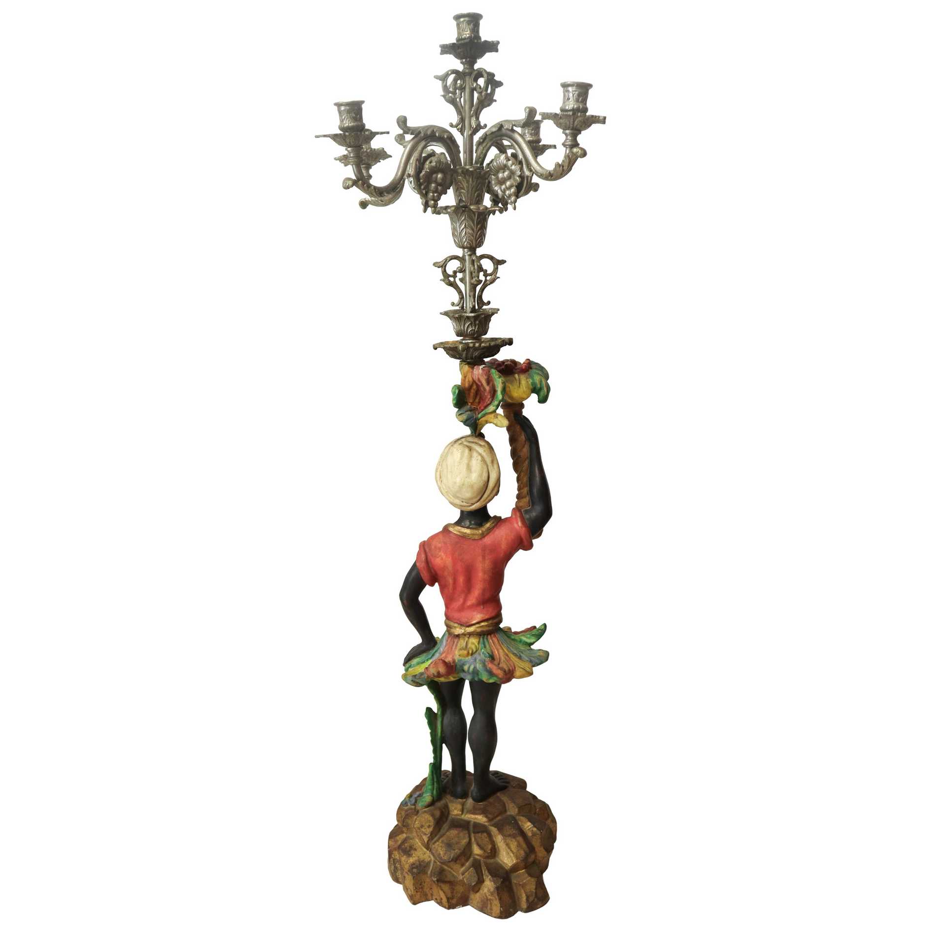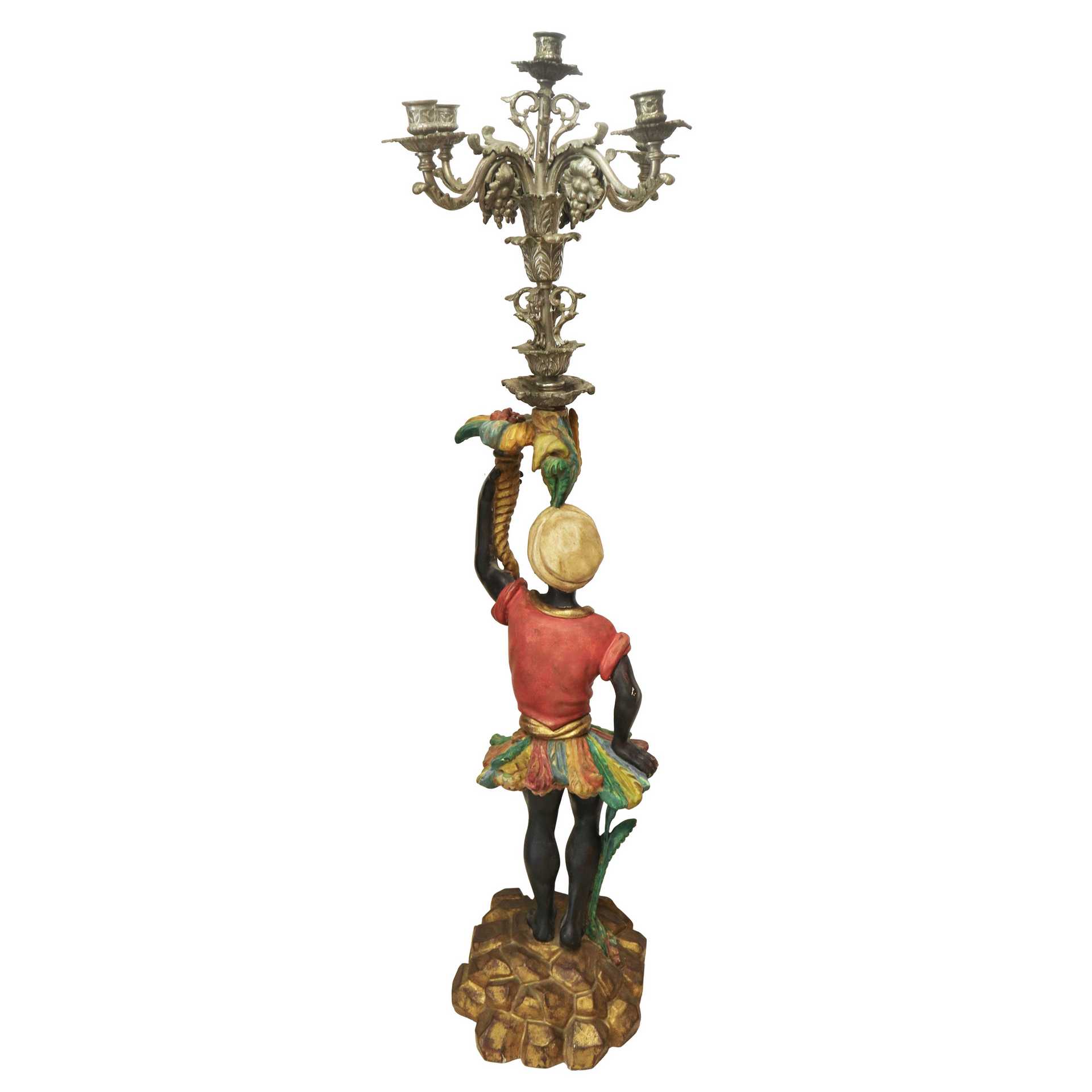 Coppia di mori veneziani in legno policromo con candelabro in metallo argentato