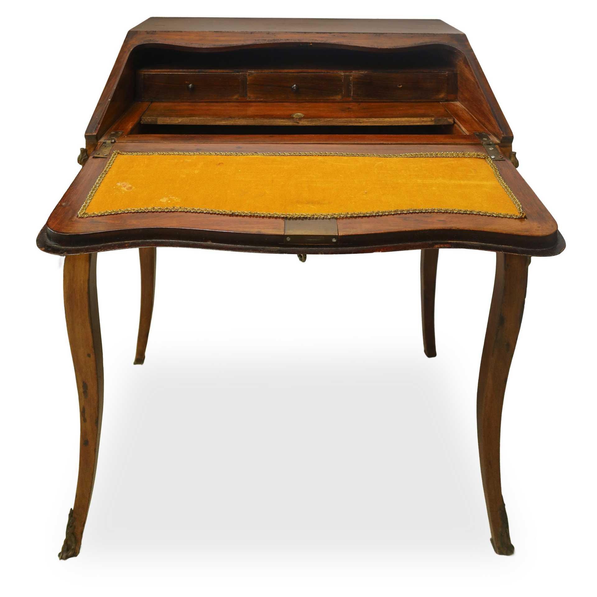 Scrivania in mogano con ribalta obliqua con intarsi a motivi floreali in legni chiari con bronzi alle gambe, France 19° secolo
