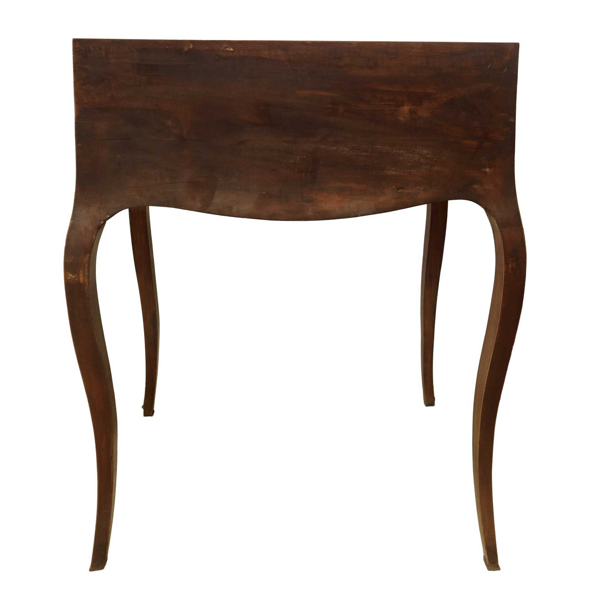 Scrivania in mogano con ribalta obliqua con intarsi a motivi floreali in legni chiari con bronzi alle gambe, France 19° secolo h cm 91,5X69,5X47
