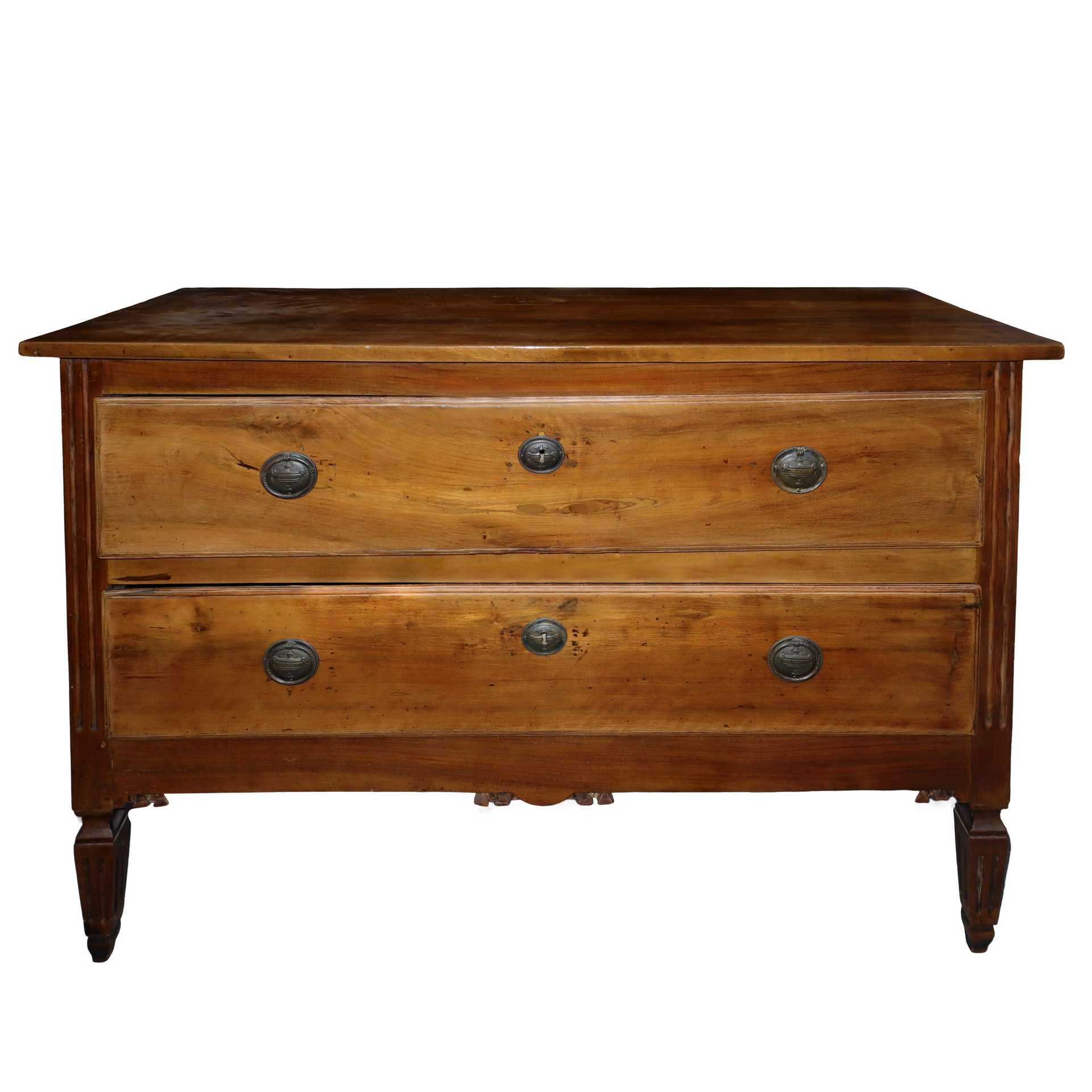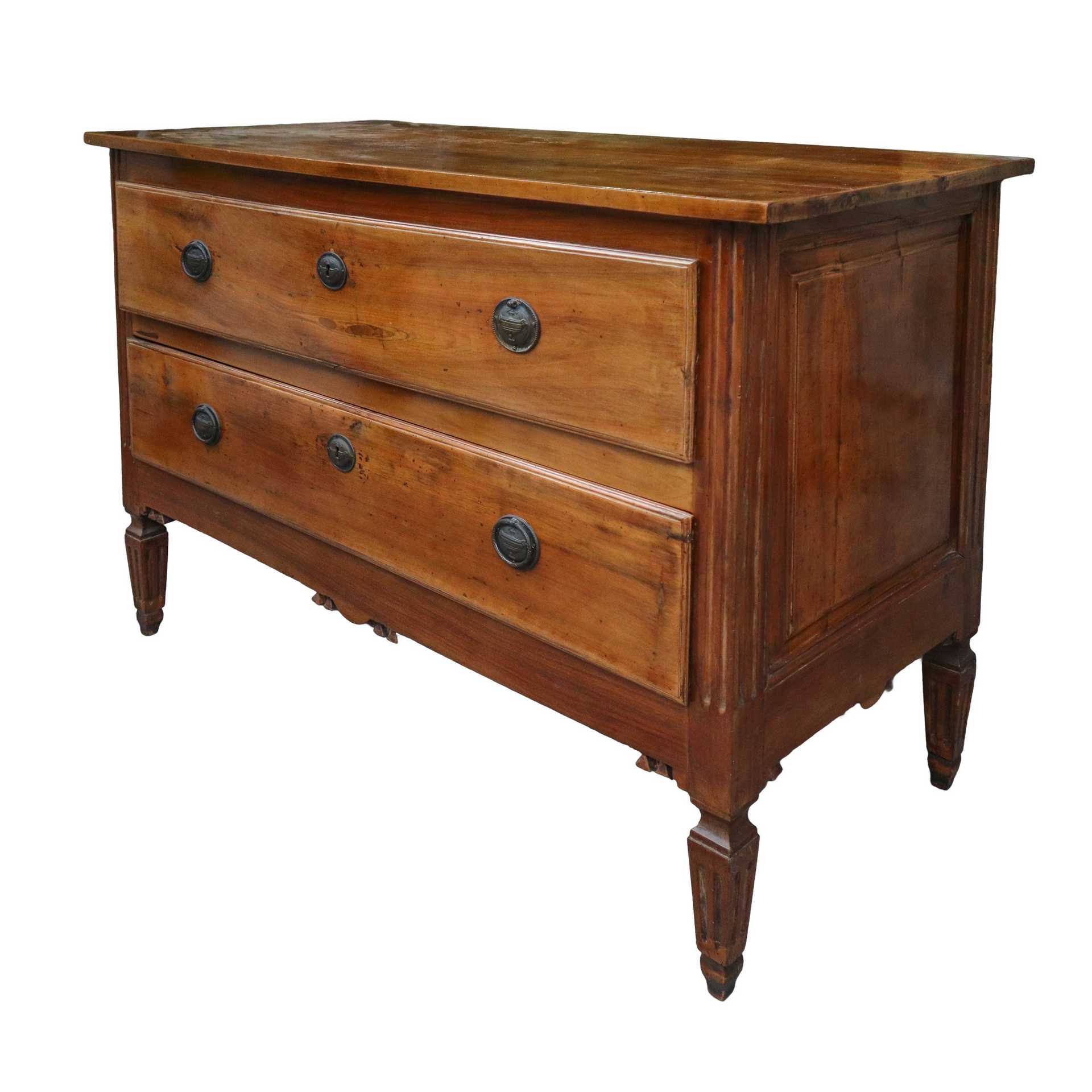 Cassettone Luigi XVI due cassetti in legno di noce con piedi troncopiramidali, maniglie e bocchette in metallo dorato applicate sul fronte, Sicily 18th/19° secolo