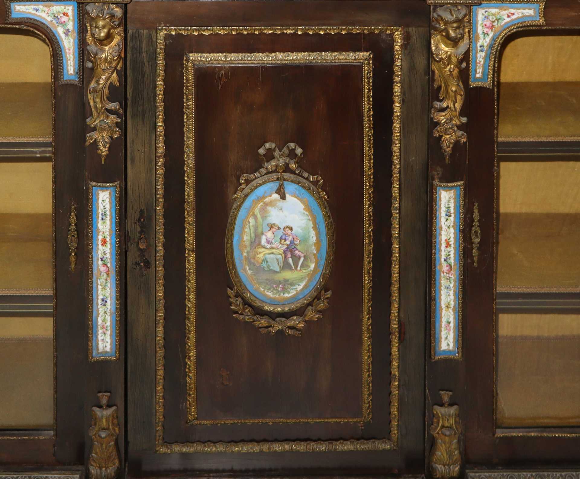 Etagère Napoleone III, France 19° secolo H cm 109 x L 154 x P 39 Con sportello centrale chiuso e due laterali a vetri. Ceramiche di Sevres applicate sul fronte. Cornici e bronzi in metallo drato applicati sul fronte. Con sportello centrale chiuso e due laterali a vetri. Ceramiche di Sevres applicate sul fronte. Cornici e bronzi in metallo drato applicati sul fronte.