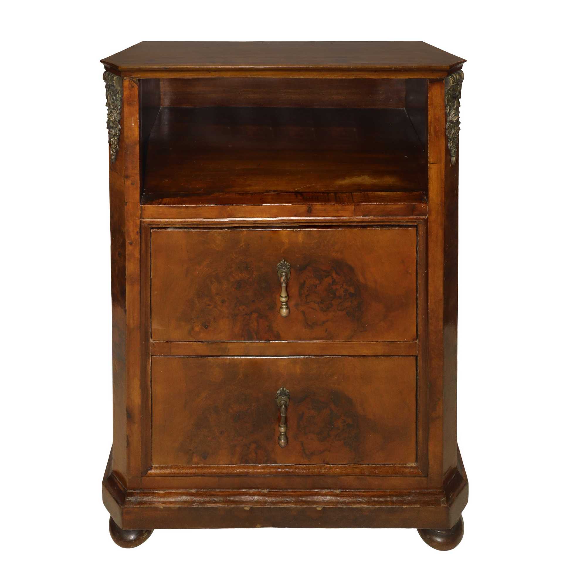 Coppia di comodini a due cassetti con bronzi ai lati e piedi a cipolla, fine 19° secolo