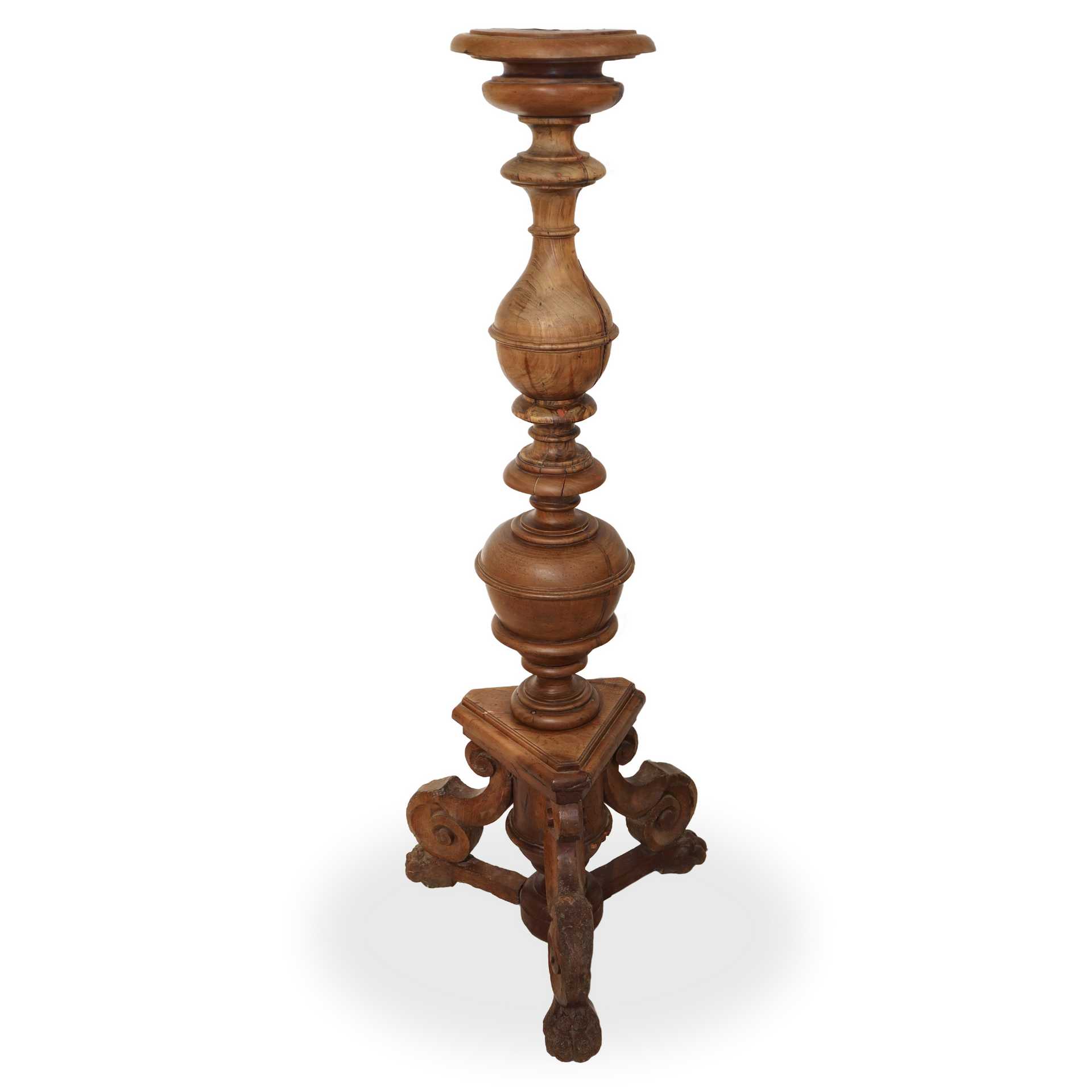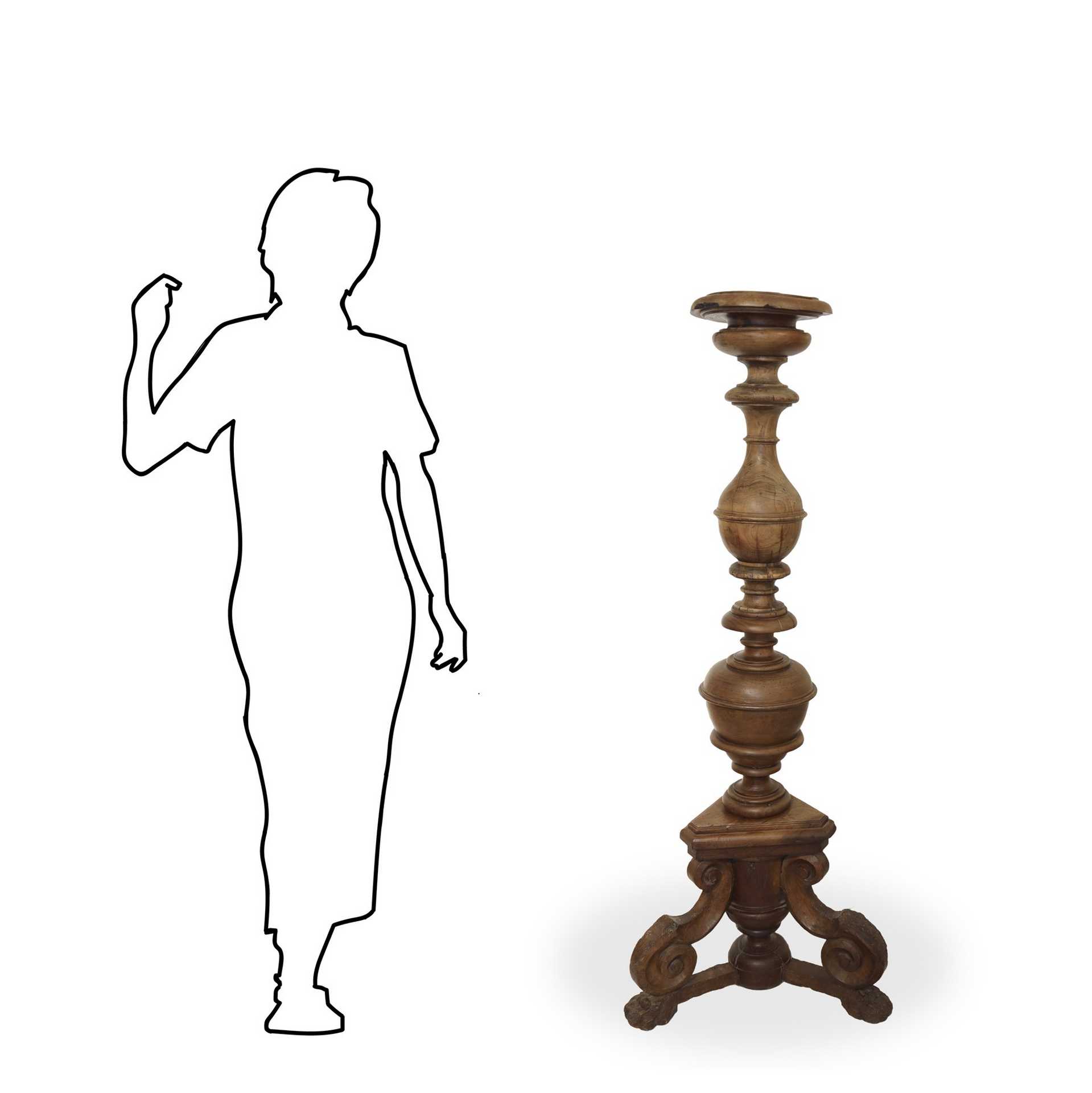 Grande candeliere in legno di noce fusto a grandi rocchetti su base triangolare, 17° secolo h cm 148X60