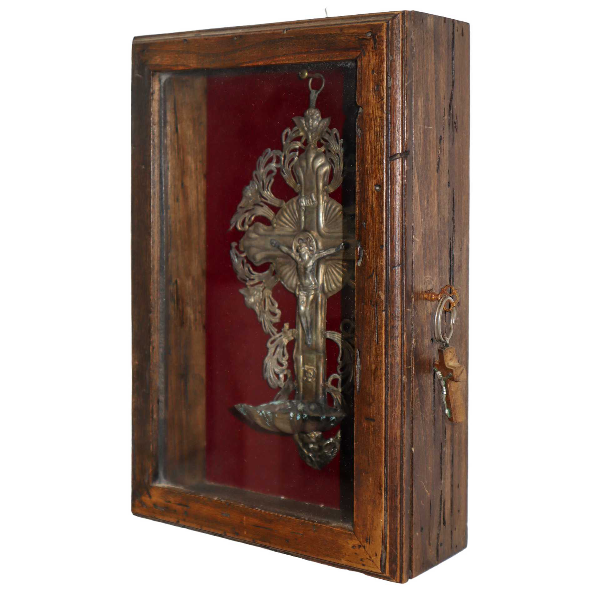 Acquasantiera in argento con Gesù Cristo in croce, entro teca in legno, Sicily, fine 18° secolo/primi 19° secolo cm 25x13 in teca cm 30x20xcm x9 Minime rottureMinime rotture
