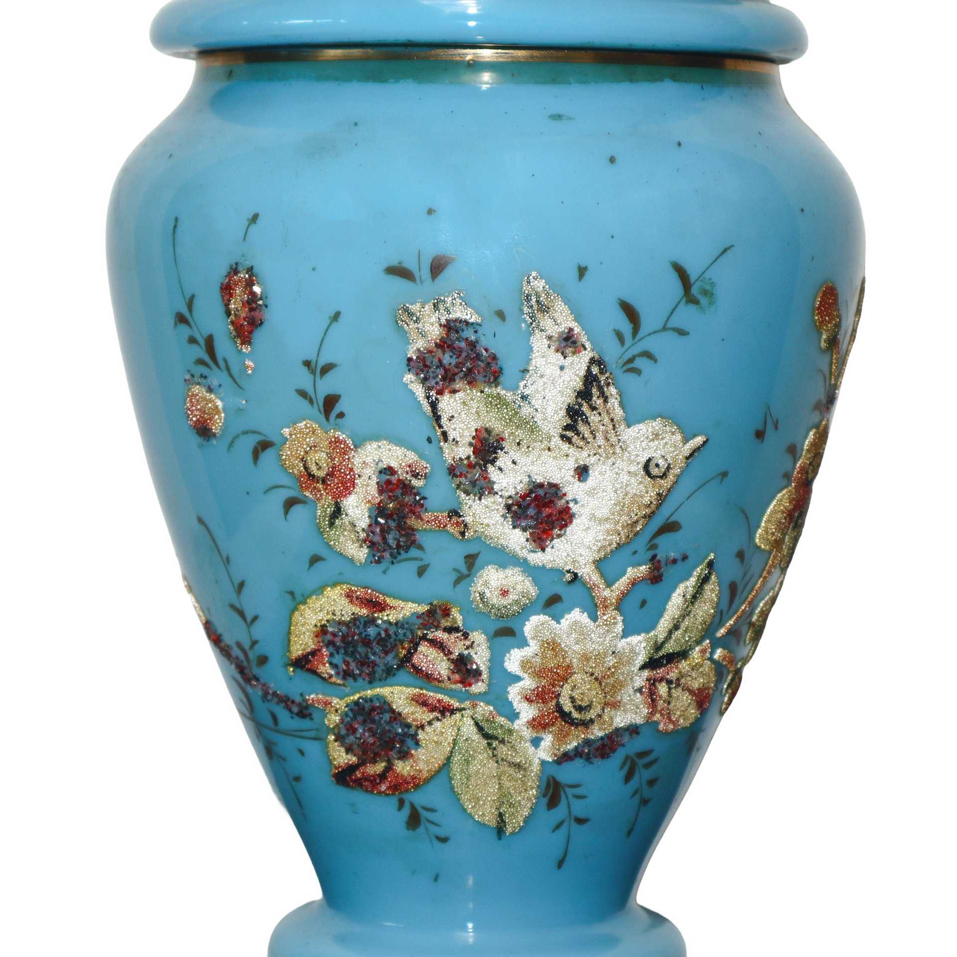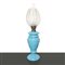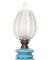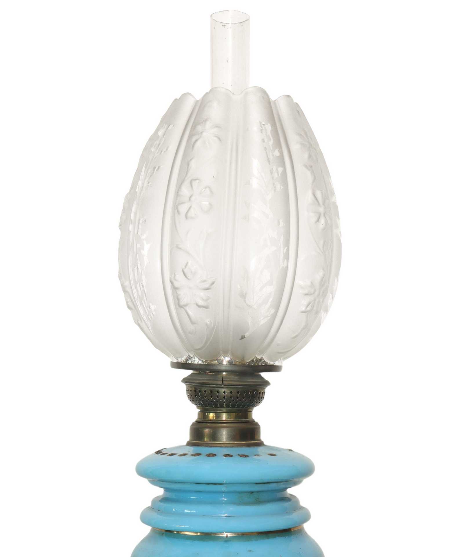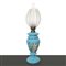 Lume a petrolio in opaline dipinta policroma su base celeste con volatile e fiori h cm 67