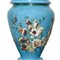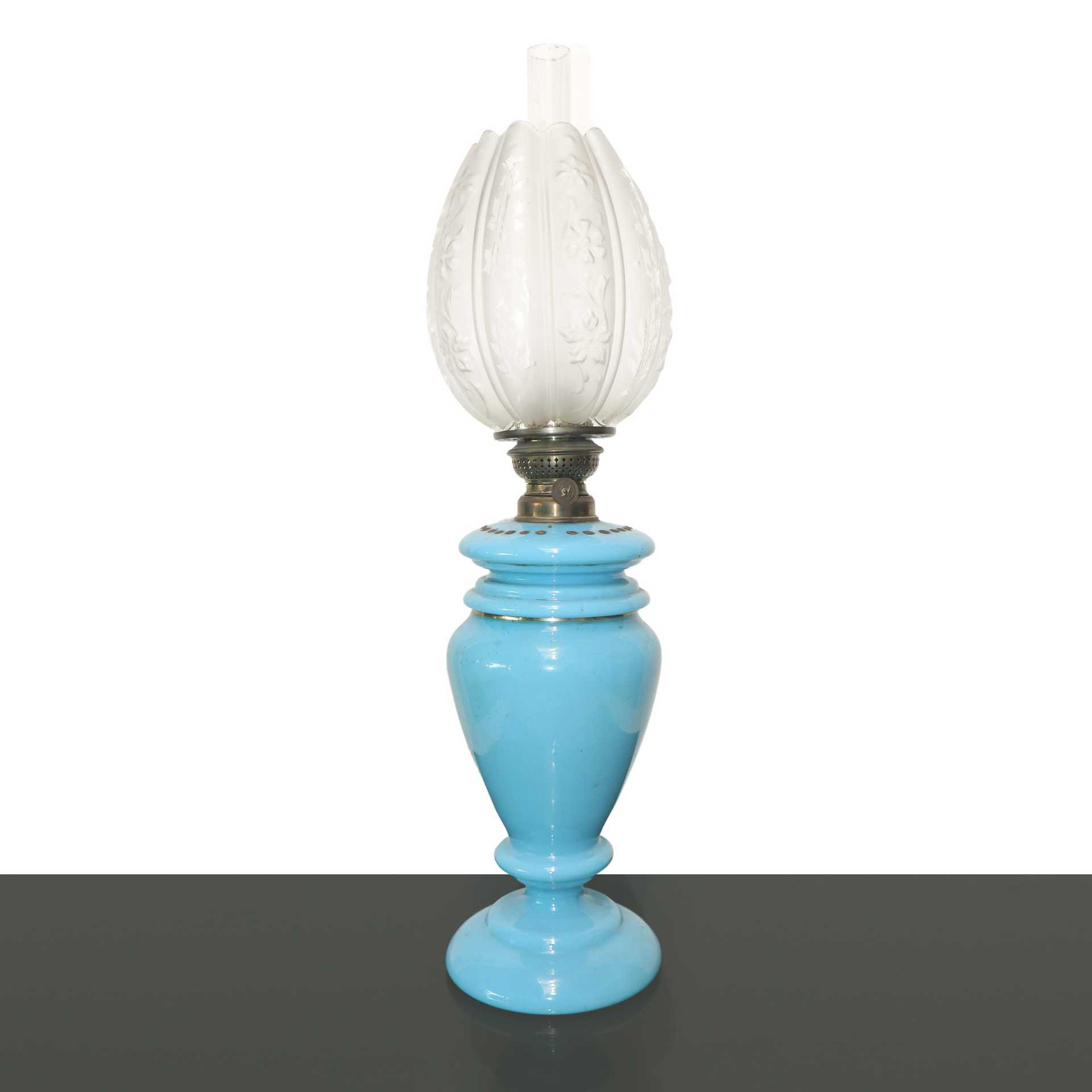 Lume a petrolio in opaline dipinta policroma su base celeste con volatile e fiori