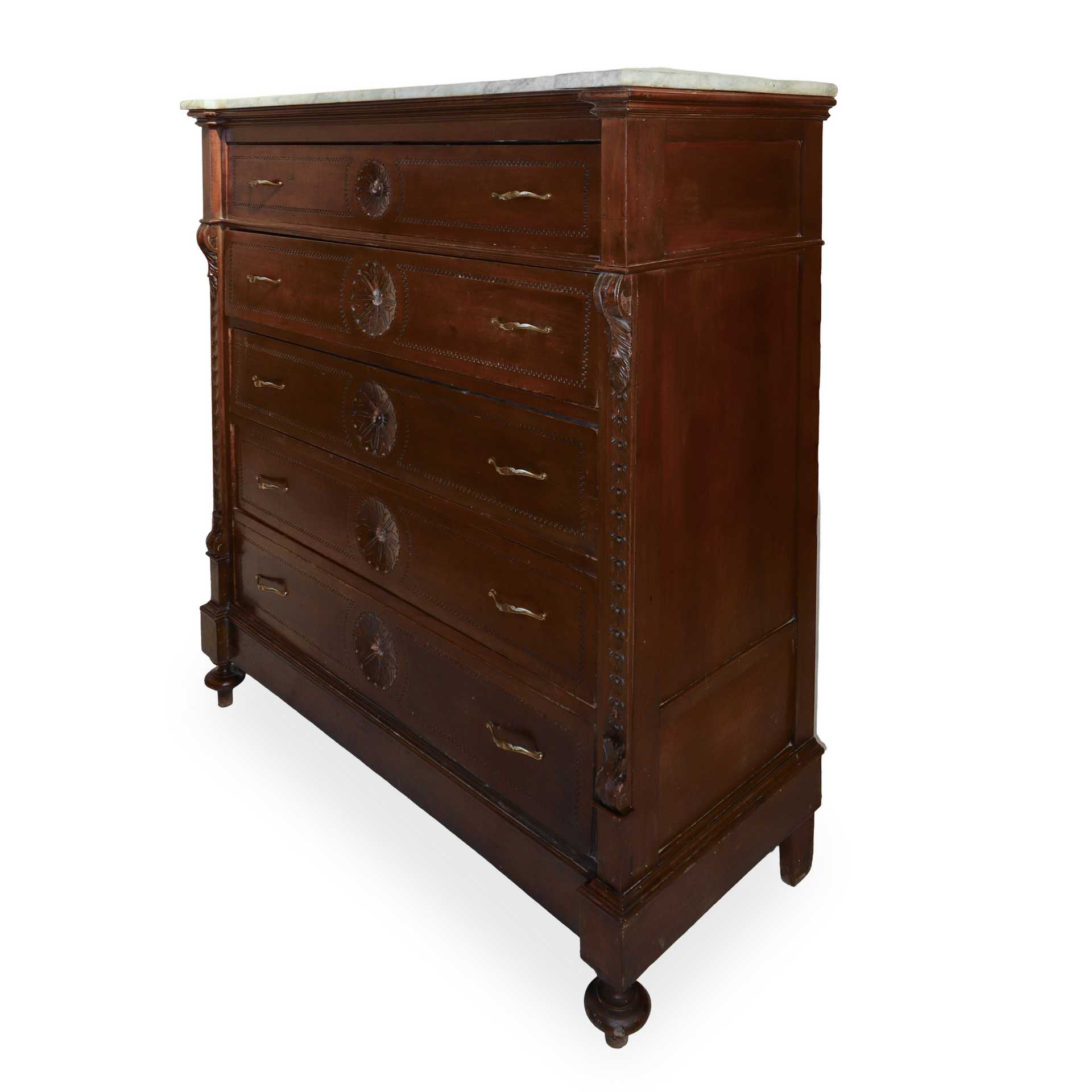 Cassettone a 5 cassetti marmo bianco carrara al piano bocchette intagliate a rosone , 19° secolo