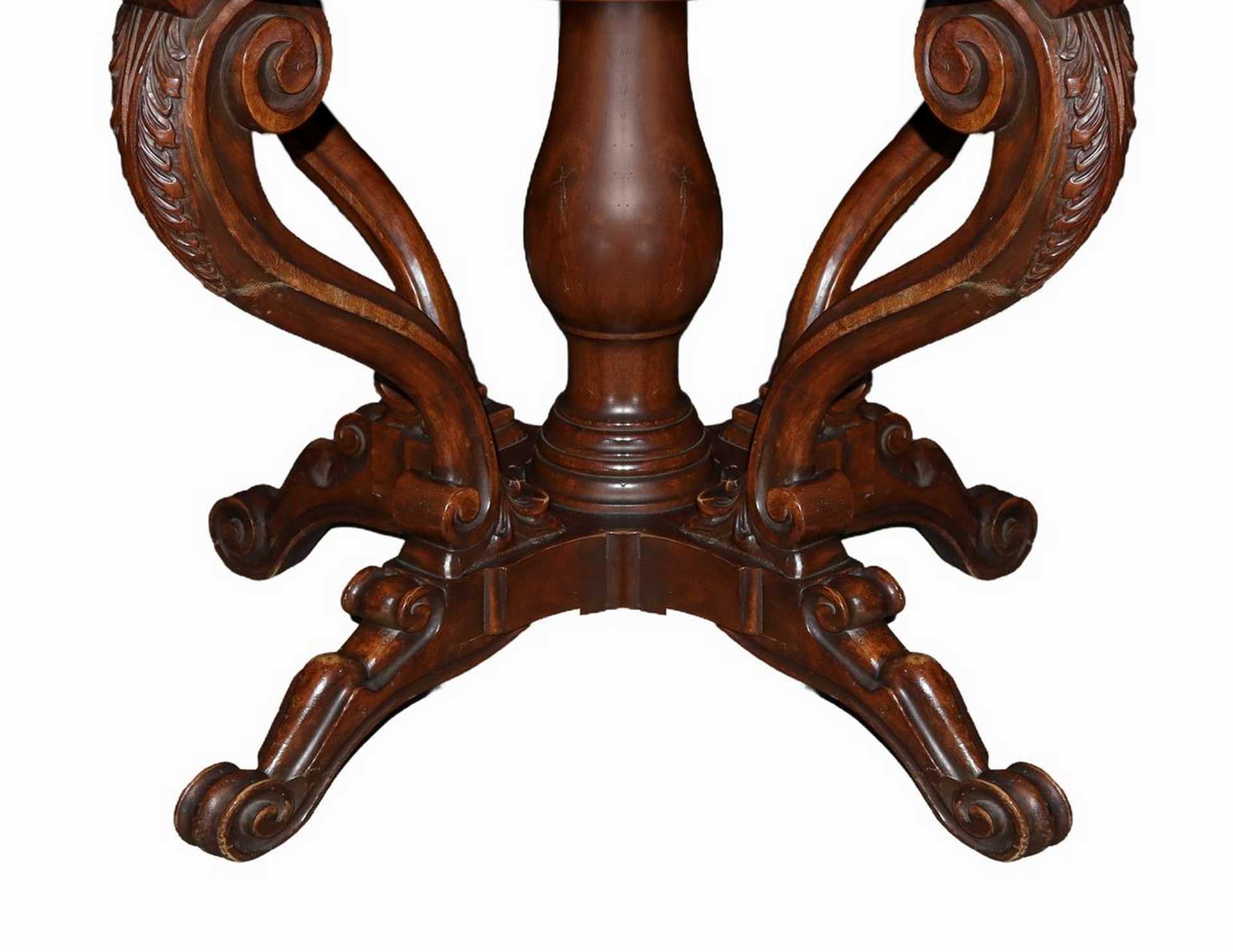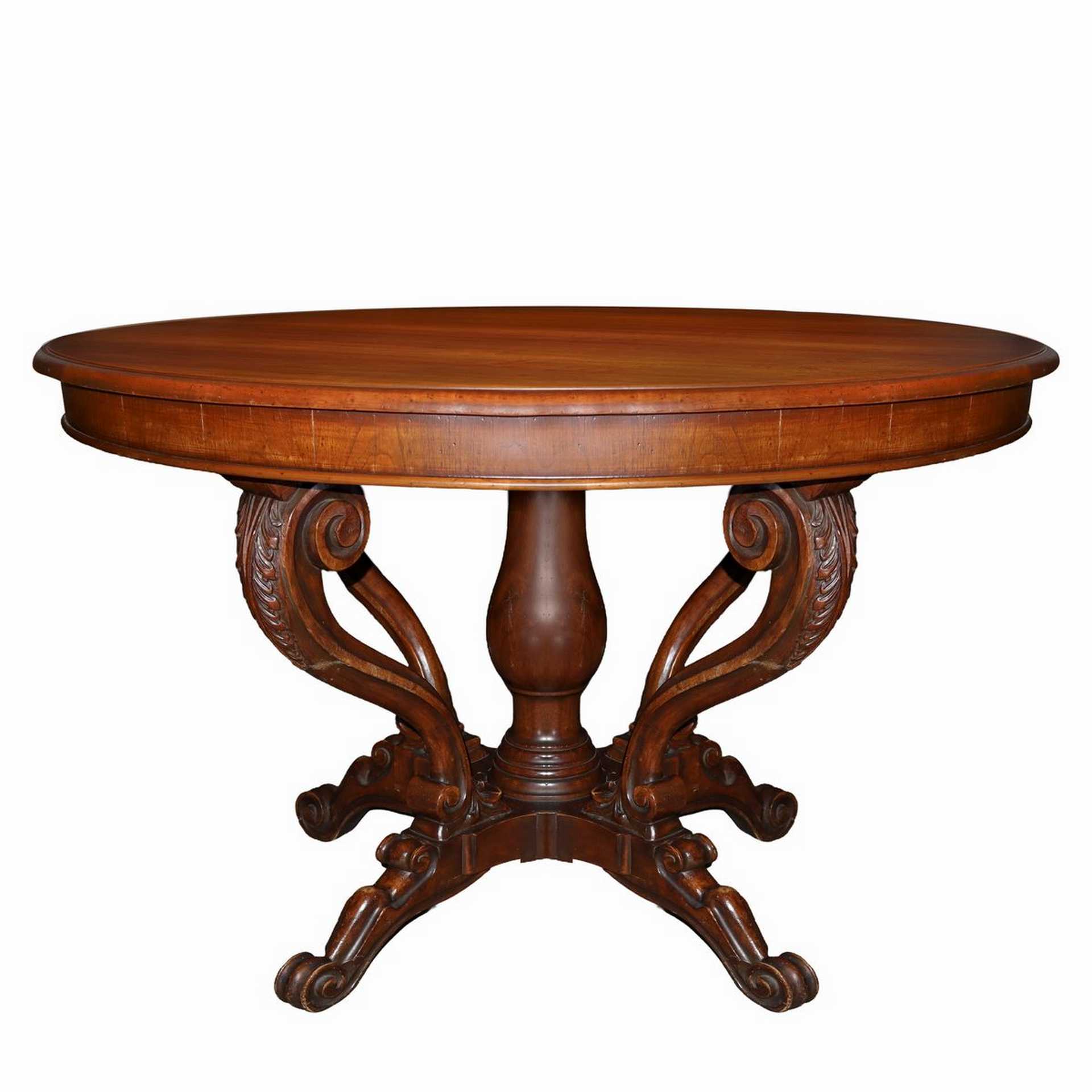 Tavolo rotondo a cesto genovese in legno di mogano, piedi a 4 razze con colonna al centro, fine 19° secolo