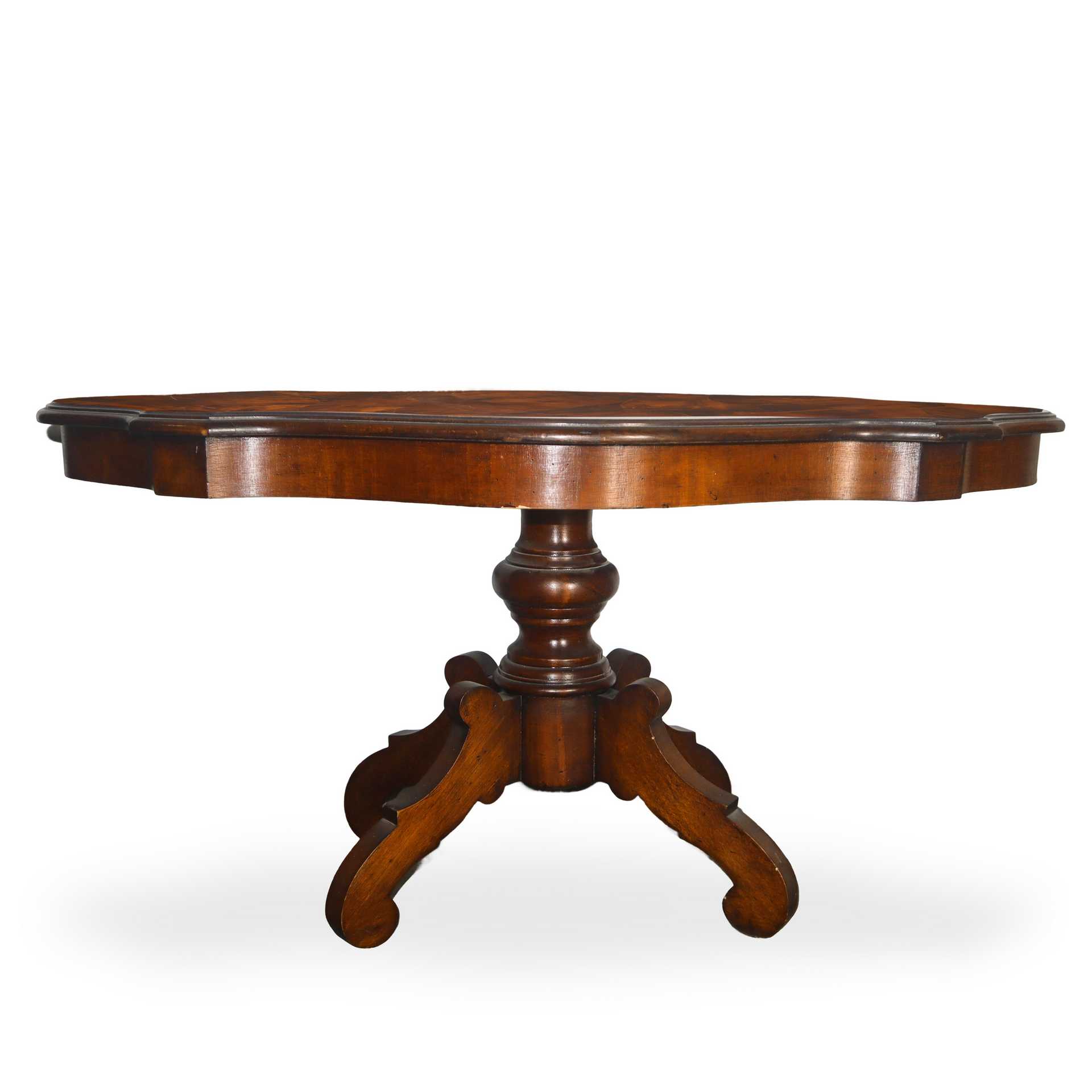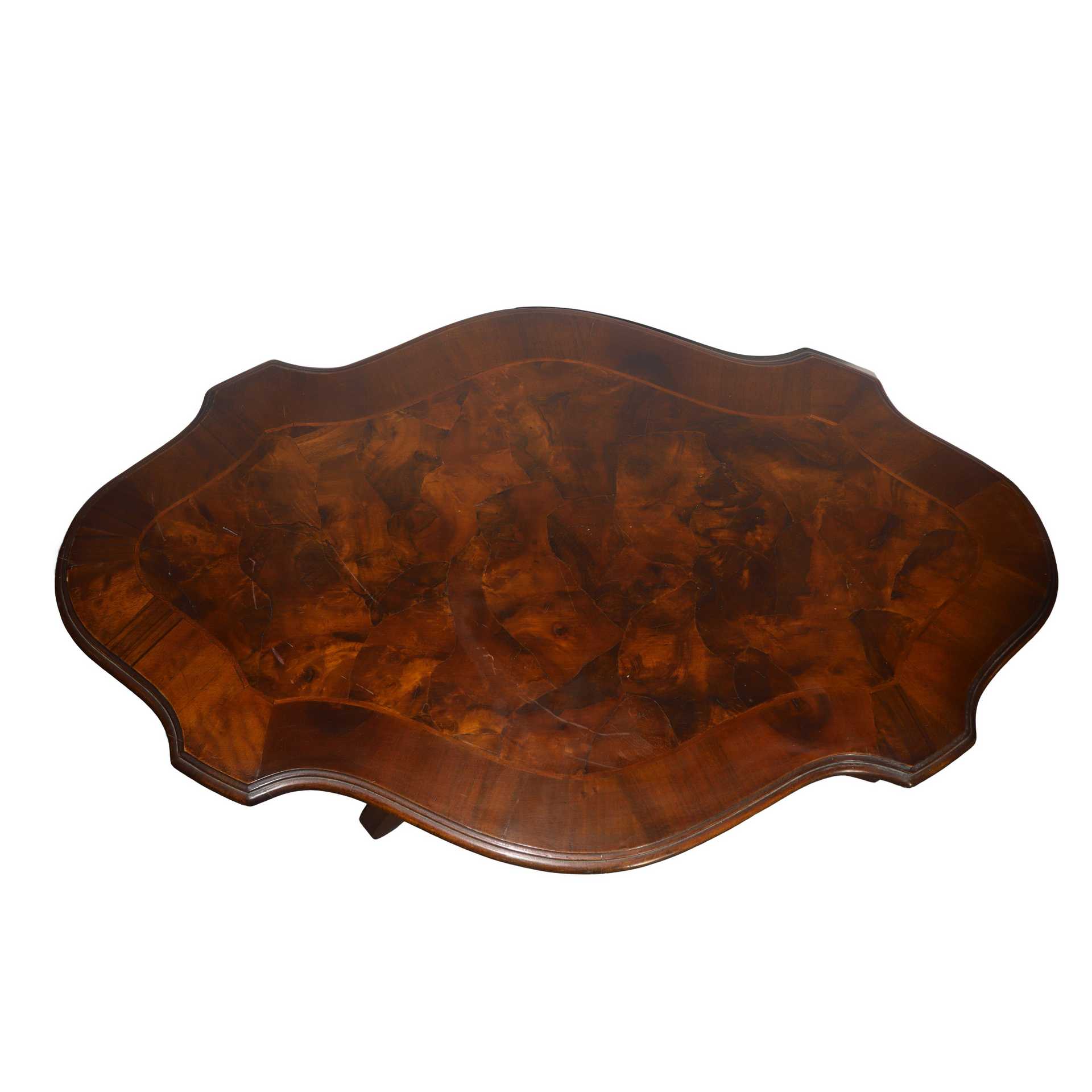 Tavolo basso a biscotto piano in radica di noce filettato con legni chiari piede a boccia a quattro razze, 19° secolo h cm 112X48 Piede Modificato Piede Modificato
