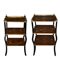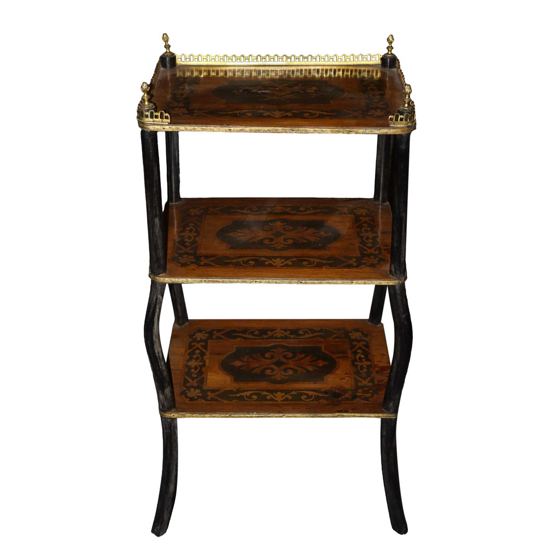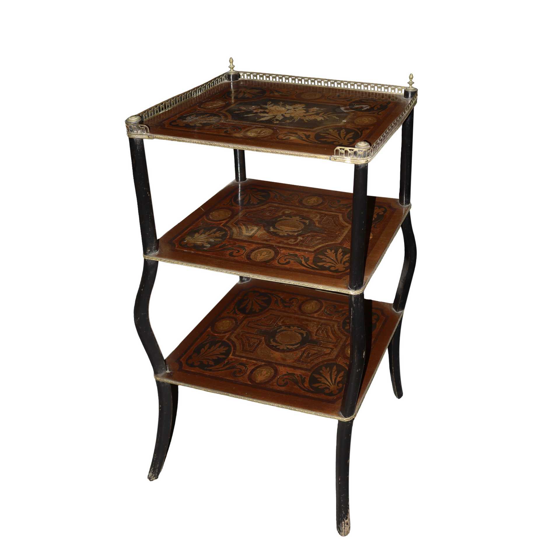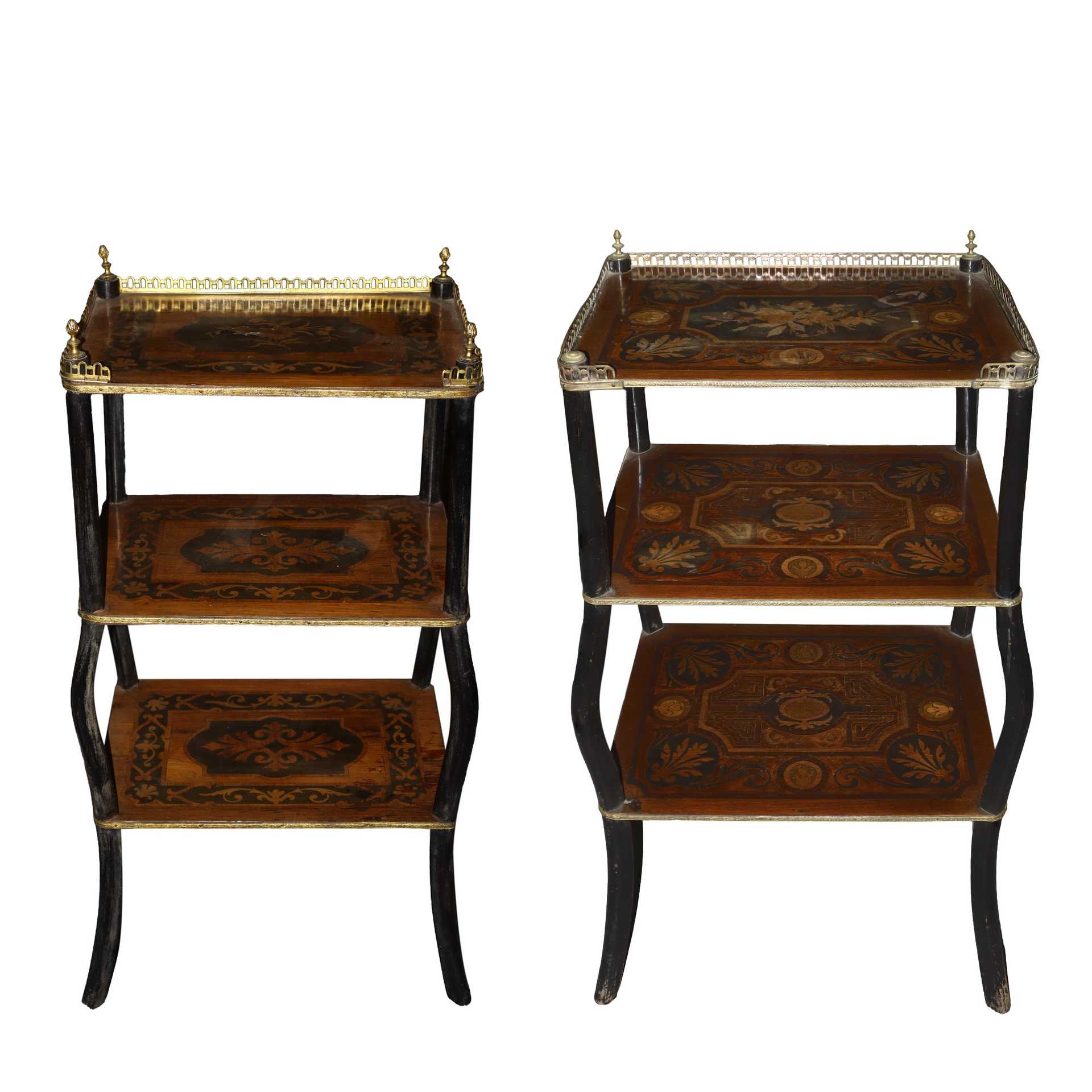 Coppia di tavolinetti a tre ripiani intarsiati, 19° secolo