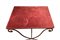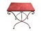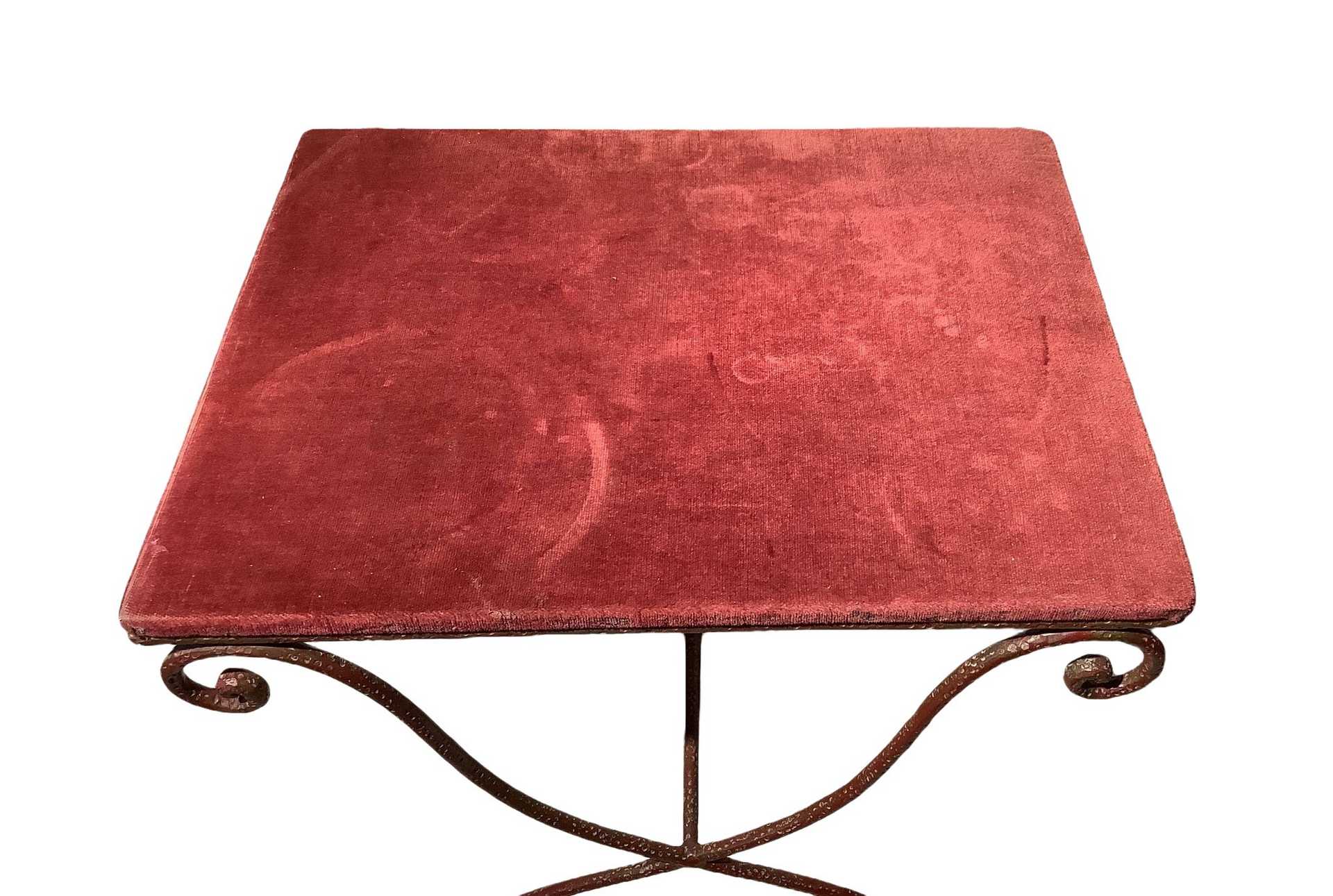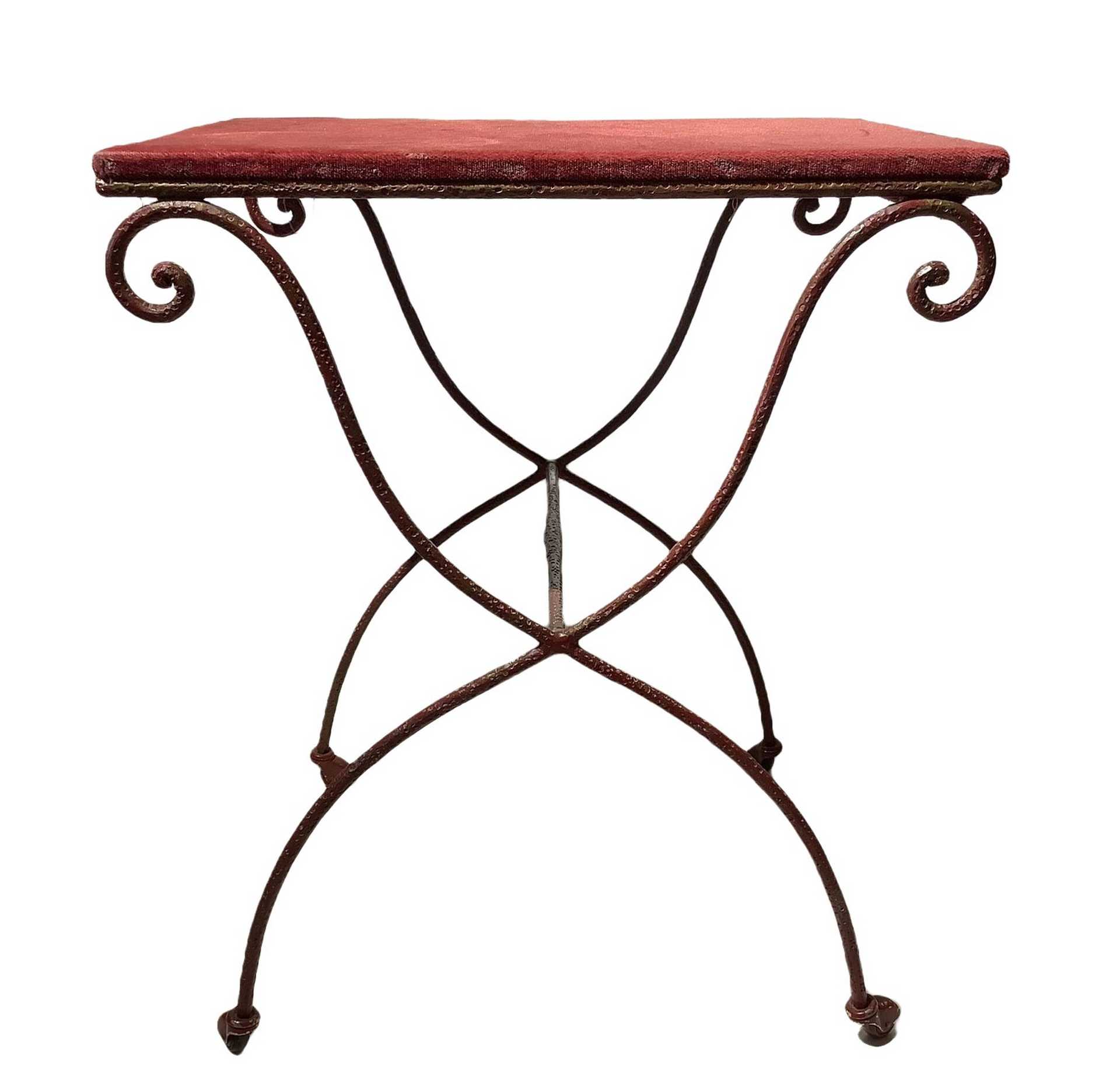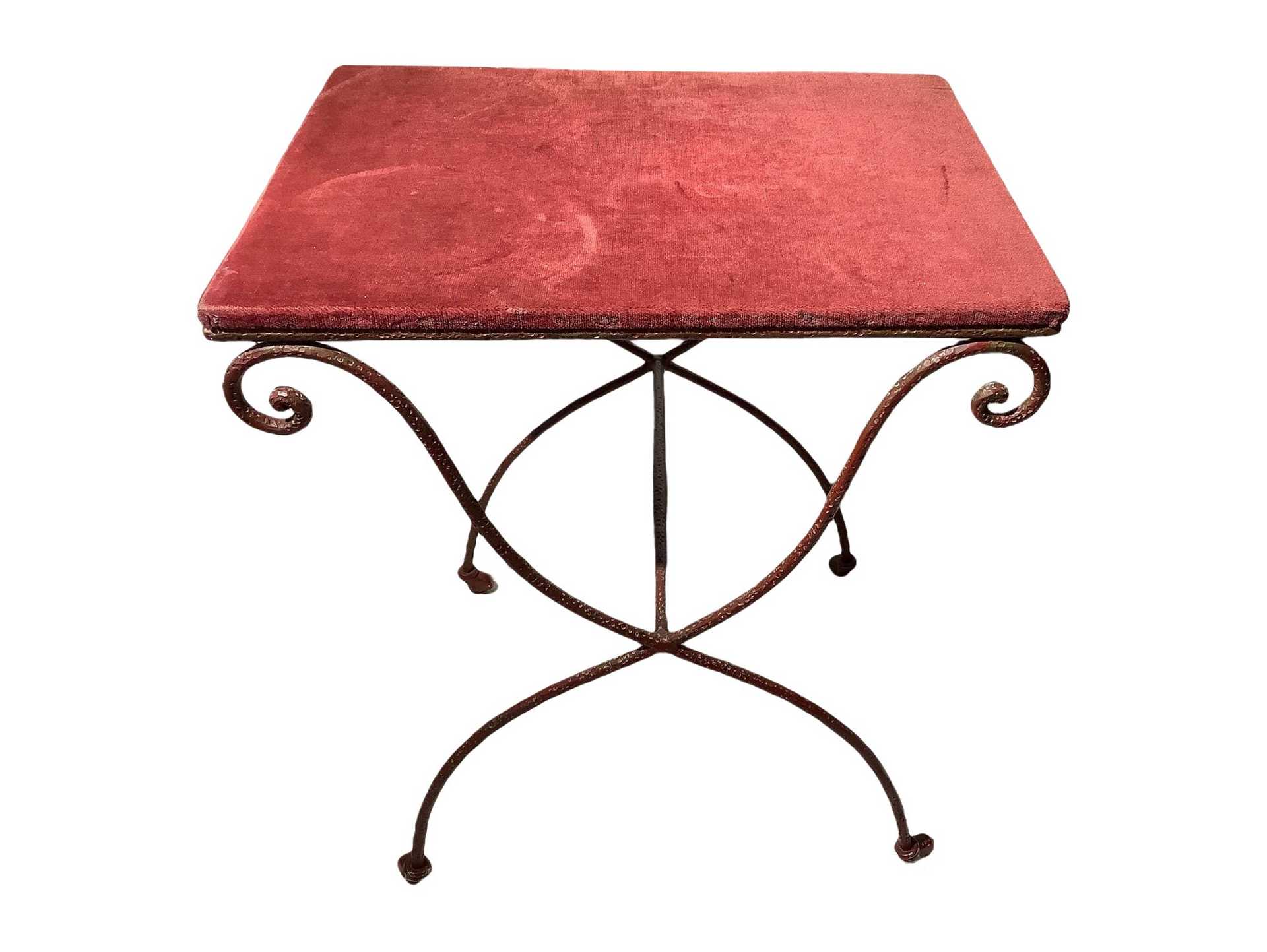 Tavolo gueridon con ruote, primi 20° secolo H 79 cm, 50x65 cm Ferro con struttura in tondino metallico curvato e superficie con lavorazione martellata. Piano in legno rivestito in panno nei toni del borgogna. Attribuibile alla manifattura Aurelio Mingazzi